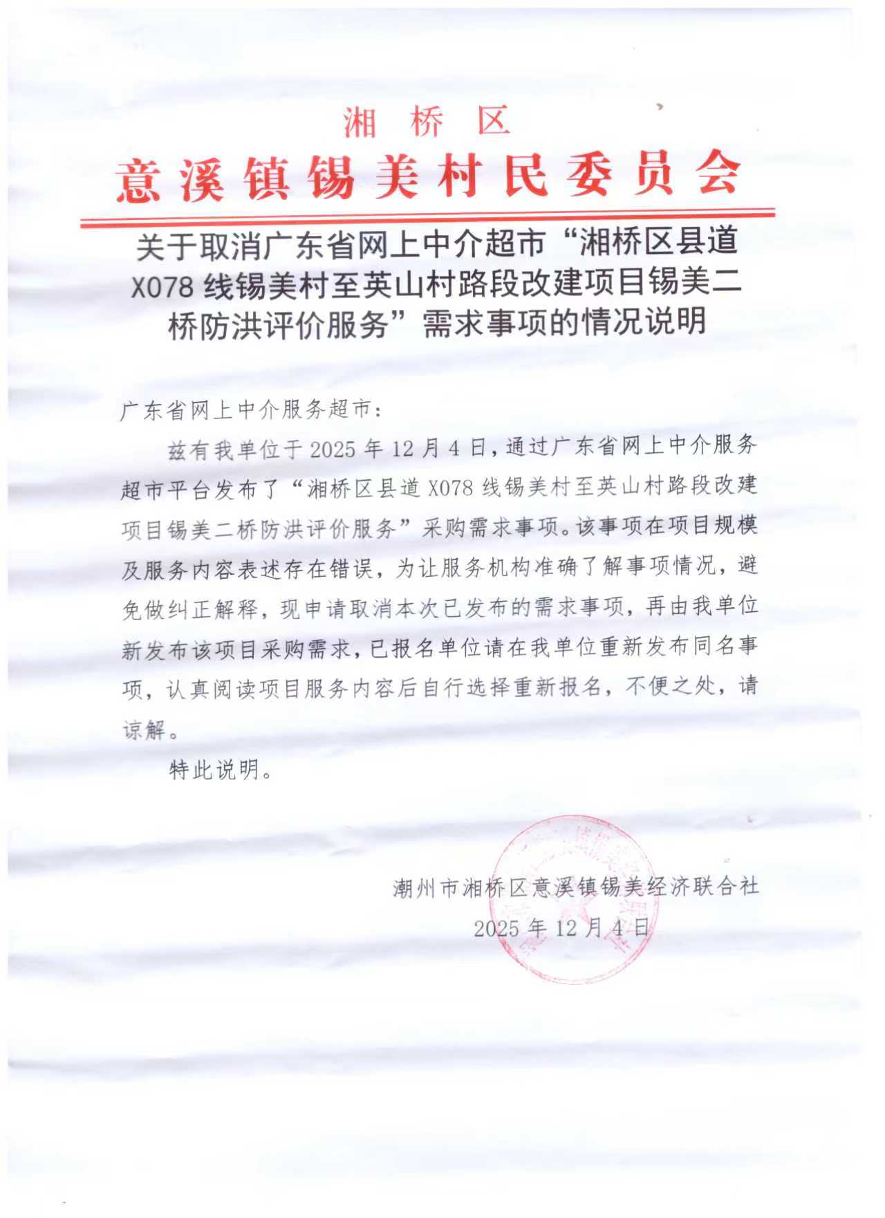 湘桥区县道X078线锡美村至英山村路段改建项目锡美二桥防洪评价服务采购失败项目公示