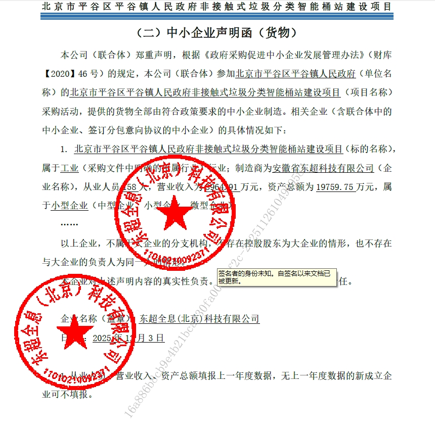 北京市平谷区平谷镇人民政府非接触式垃圾分类智能桶站建设项目中小企业声明函.***