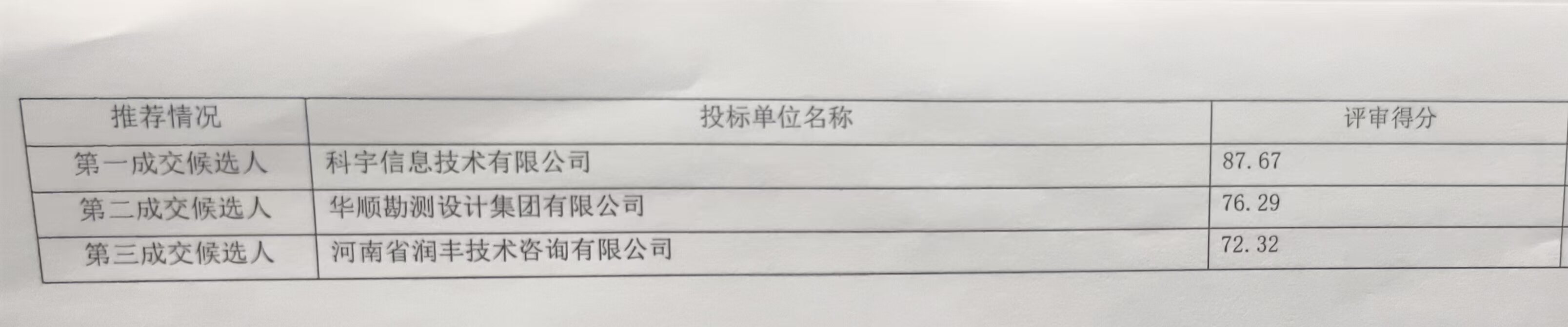 | *.本项目无供应商未通过资格审查和符合性审查;*.未成交供应商得分及排序:第*名:华顺勘测设计集团有限公司,总得分**.**分;第*名:河南省润丰技术咨询有限公司,总得分**.**分;*.各有关当事人对成交结果有异议的,可以在本公告发布之日起七个工作日内,以书面形式向采购人和采购代理机构提出质疑(加盖单位公章且法人签字),由法定代表人或其原授权代表携带企业营业执照副本原件及本人身份证件(原件)一并提交(邮寄、传真件不予受理),质疑应当有明确的请求和必要的证明材料,并以质疑函接受确认日期作为受理时间,逾期未提交或未按照要求提交的质疑函将不予受理。*.本项目接受联合体投标。联合体牵头人:科宇信息技术有限公司,联合体成员:南阳市自然资源调查规划院。 | |||||||||||||||||||||||||||||||