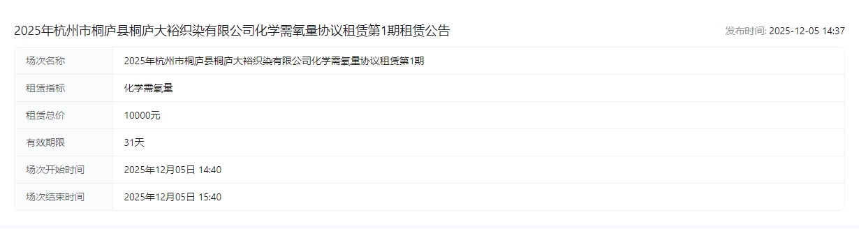 大裕织染有限公司化学需氧量协议租赁第1期租赁公告