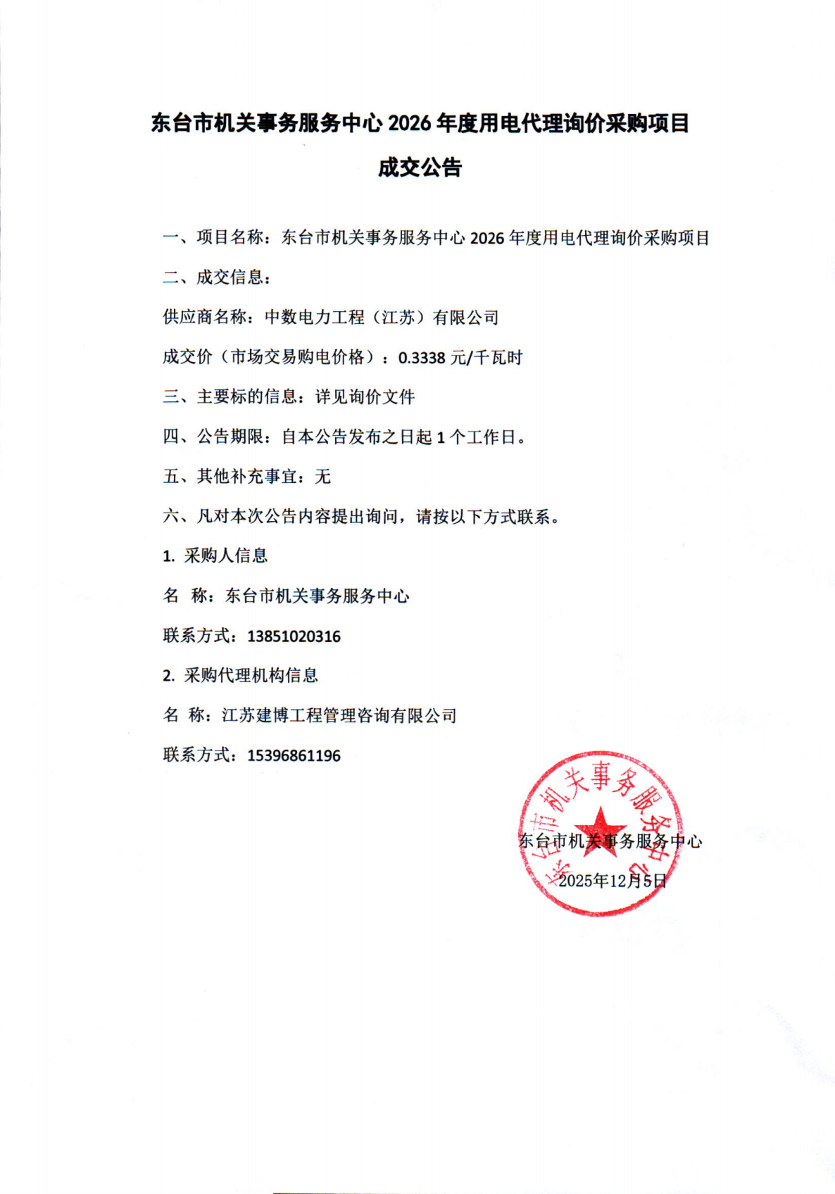 东台市机关事务服务中心2026年度用电代理询价采购项目成交公告