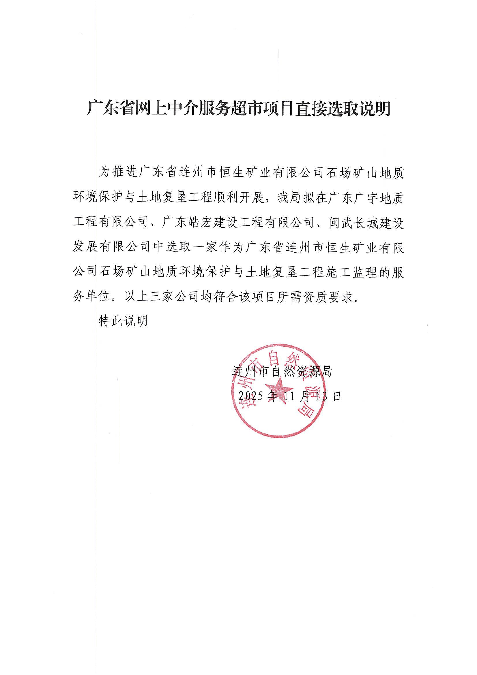 关于为【广东省连州市恒生矿业有限公司石场矿山地质环境保护与土地复垦工程施工监理服务】公开选取【地质灾害评估和治理工程勘查设计施工监理】机构的公告