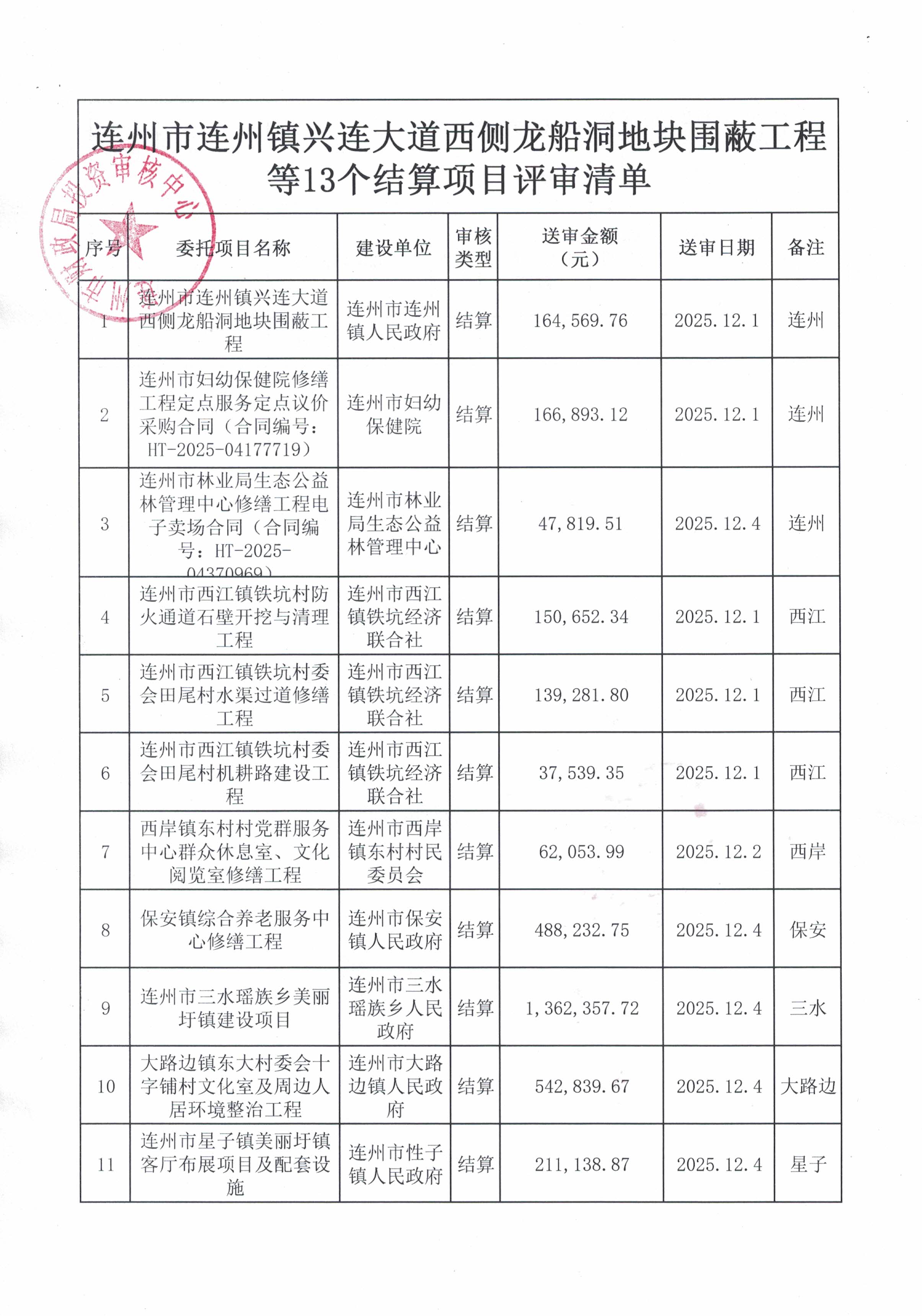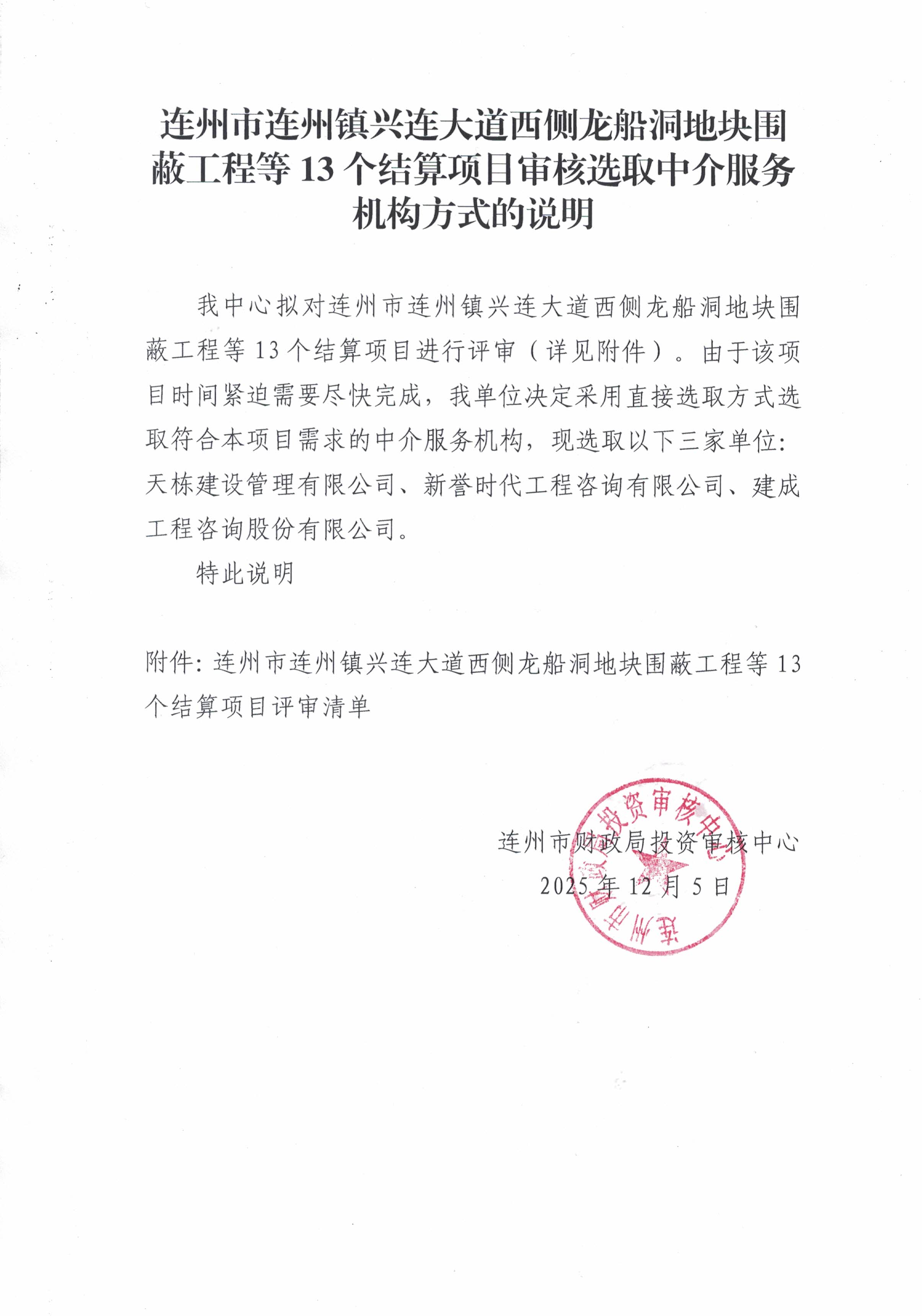 连州市连州镇兴连大道西侧龙船洞地块围蔽工程等13个结算项目评审采购公告