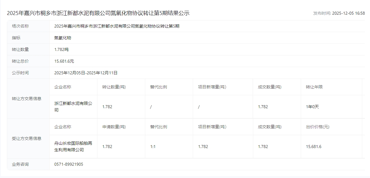 市浙江新都水泥有限公司氮氧化物协议转让第5期结果公示