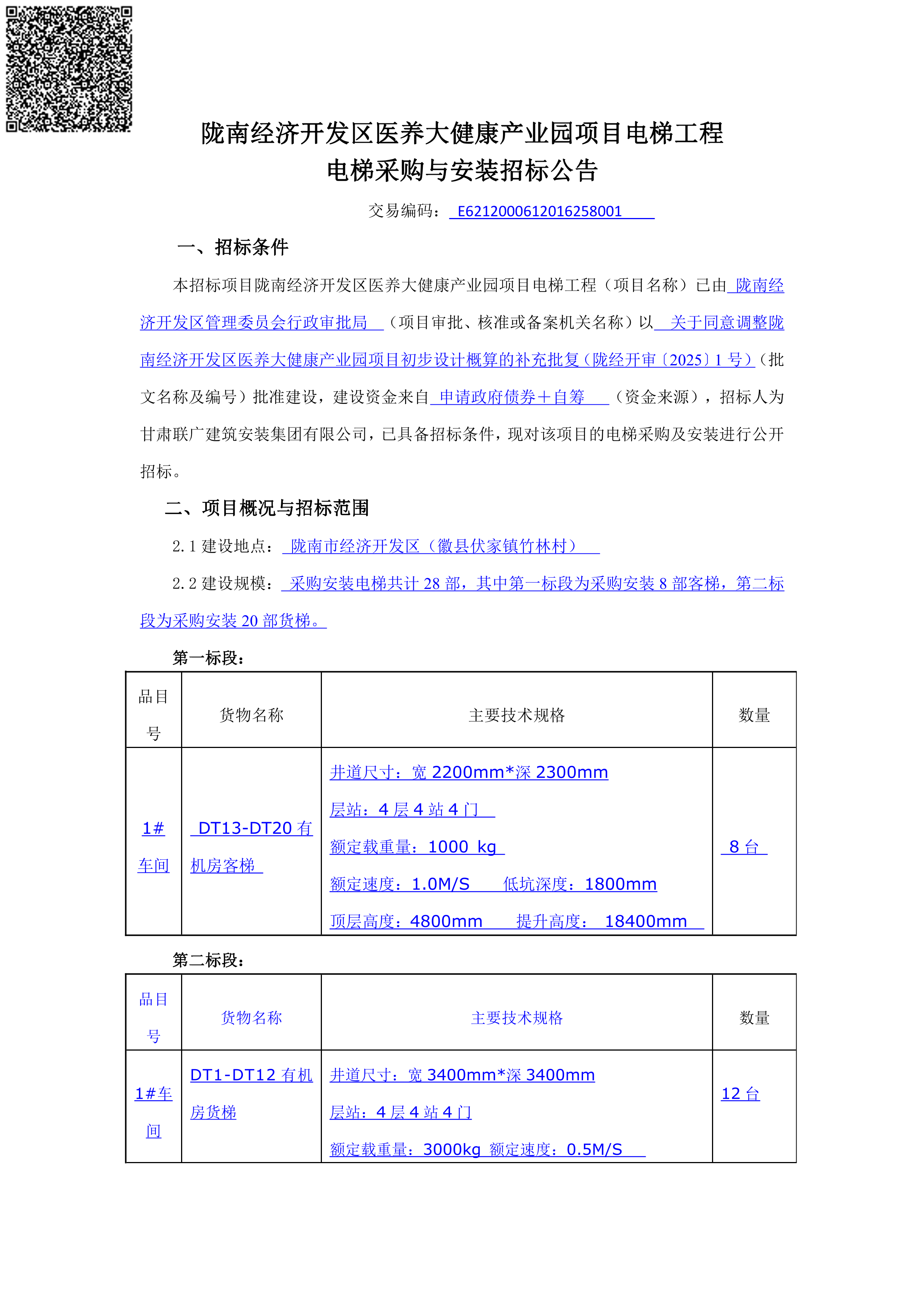 陇南经济开发区医养大健康产业园项目电梯工程电梯采购与安装招标公告