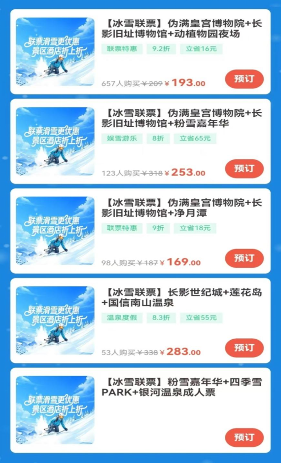 在微信小程序“君至长春”首页,点击“雪季惠民”按钮进入,即可看到多种不同组合方式的“冰雪联票”,让游客和市民用“一票到底”享受最多优惠。