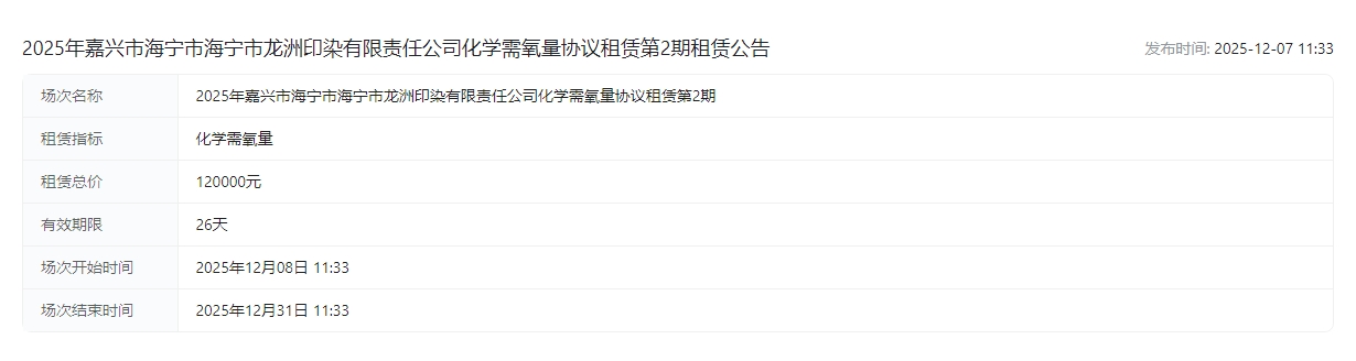 2025年嘉兴市海宁市海宁市龙洲印染有限责任公司化学需氧量协议租赁第2期租赁公告交易公告