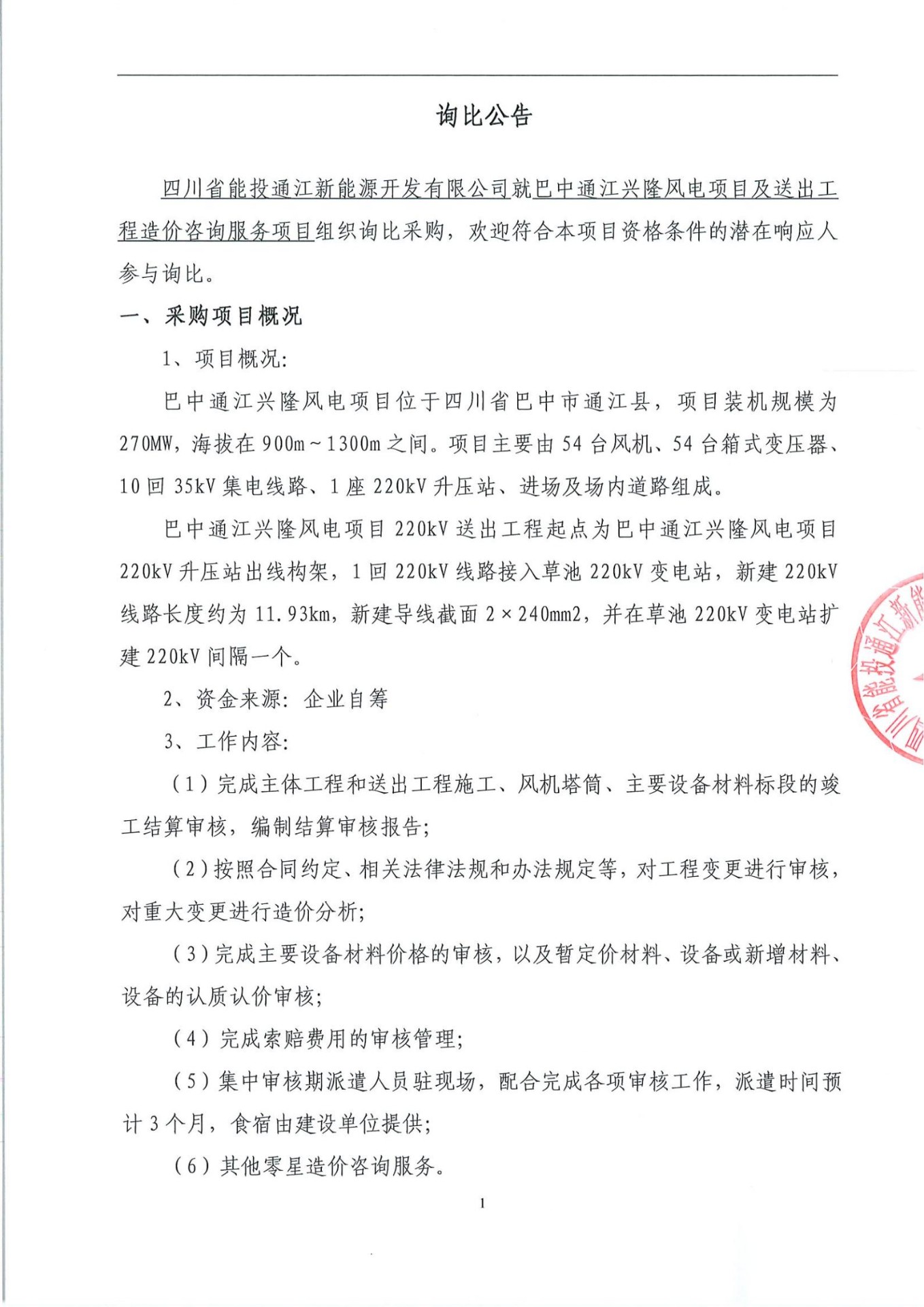 四川省能投通江新能源开发有限公司关于巴中通江兴隆风电项目及送出工程造价咨询服务项目的询比采购公告