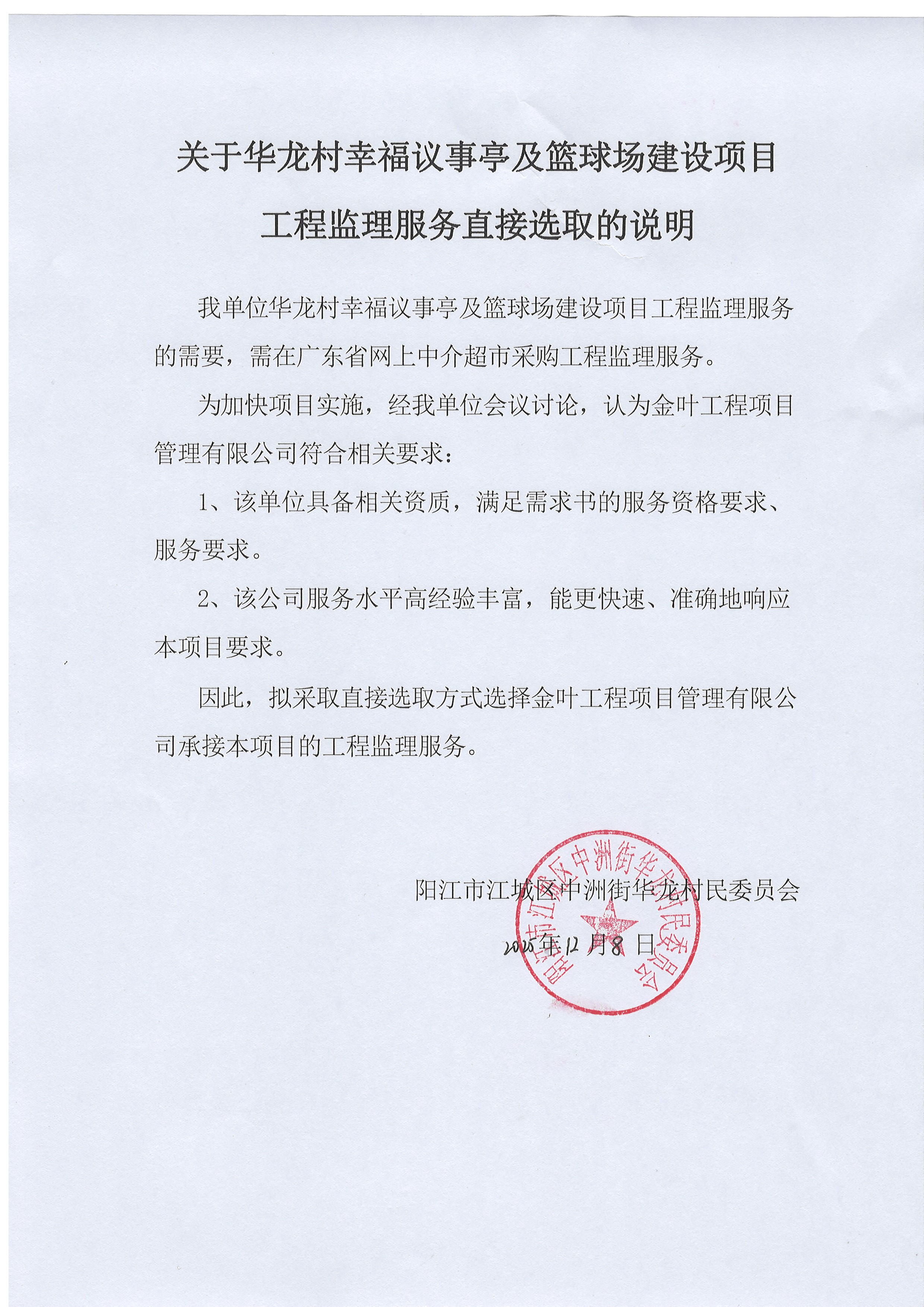 关于【华龙村幸福议事亭及篮球场建设项目(监理服务)】中选结果的公告