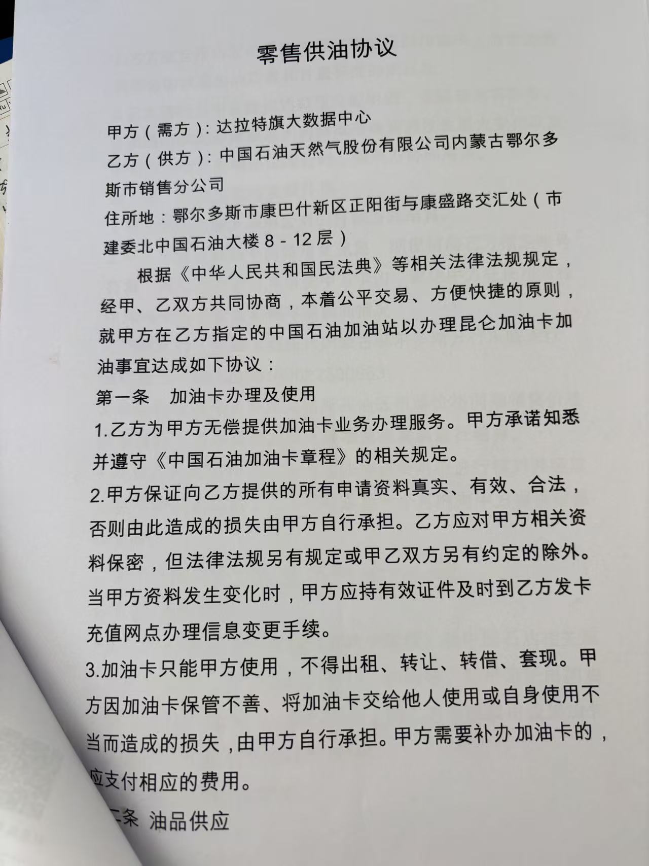 一、合同编号:*******二、合同名称:零售供油合同三、项目编号:鄂财购备字(电子)[****]*******号四、项目名称:加油五、合同主体采购人(甲方):达拉特旗大数据中心 地址:鄂尔多斯市达拉特旗 联系方式:************ 供应商(乙方):中国石油天然气股份有限公司内蒙古鄂尔多斯市销售分公司 地址:内蒙古自治区鄂尔多斯市康巴什区正阳街与康盛路交汇处 联系方式:*********** 六、合同主要信息主要标的: