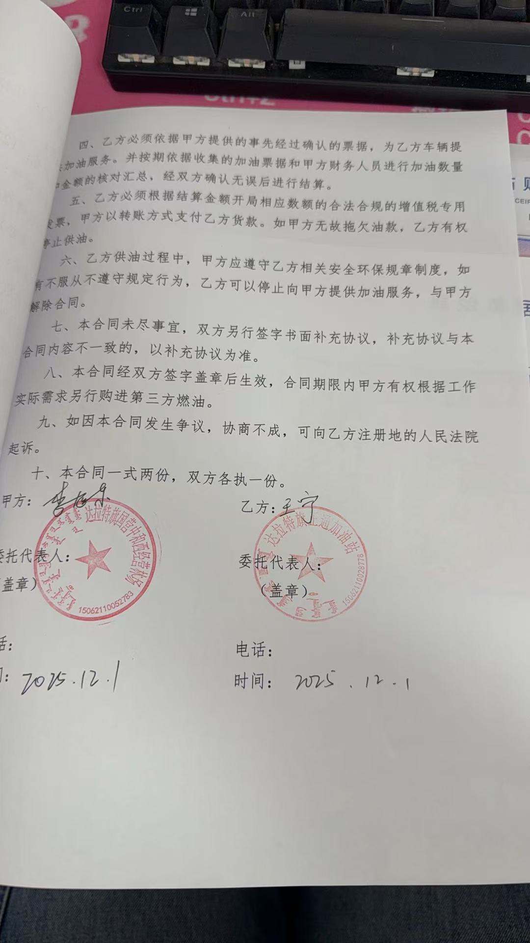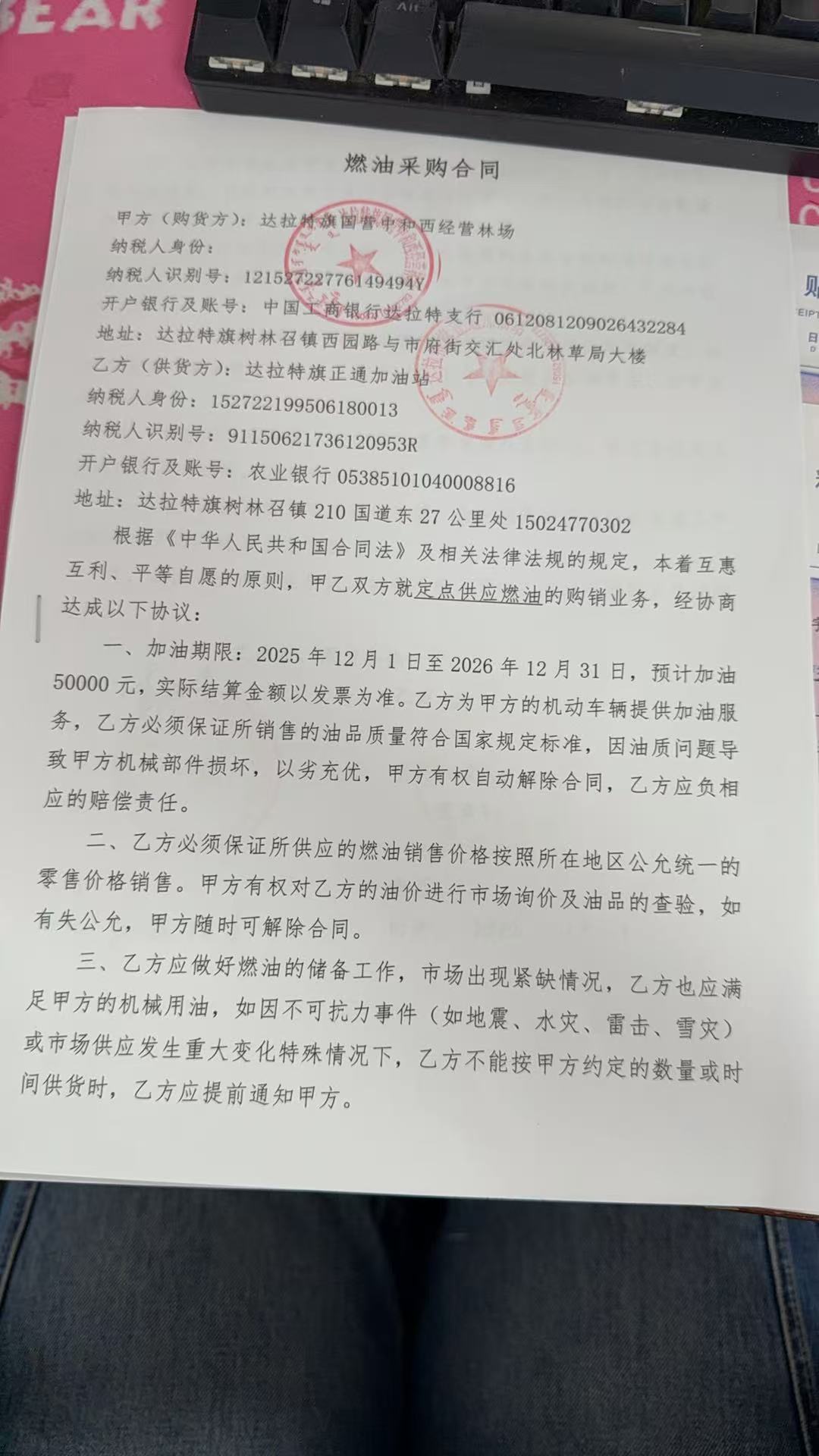 一、合同编号:***二、合同名称:加油合同三、项目编号:鄂财购备字(电子)[****]*******号四、项目名称:加油项目五、合同主体采购人(甲方):达拉特旗国营中和西经营林场 地址:鄂尔多斯市达拉特旗 联系方式:*********** 供应商(乙方):达拉特旗正通加油站 地址:内蒙古自治区鄂尔多斯市达拉特旗树镇***国道东**公里处 联系方式:*********** 六、合同主要信息主要标的: