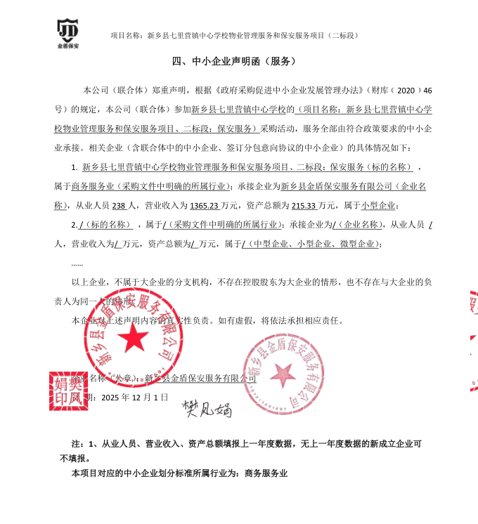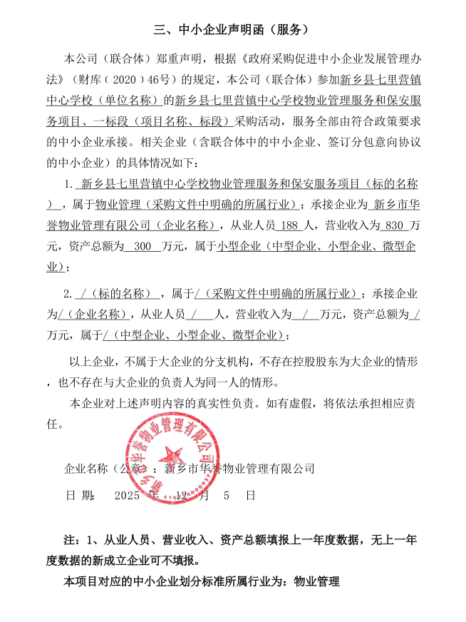 新乡县七里营镇中心学校物业管理服务和保安服务项目结果公告