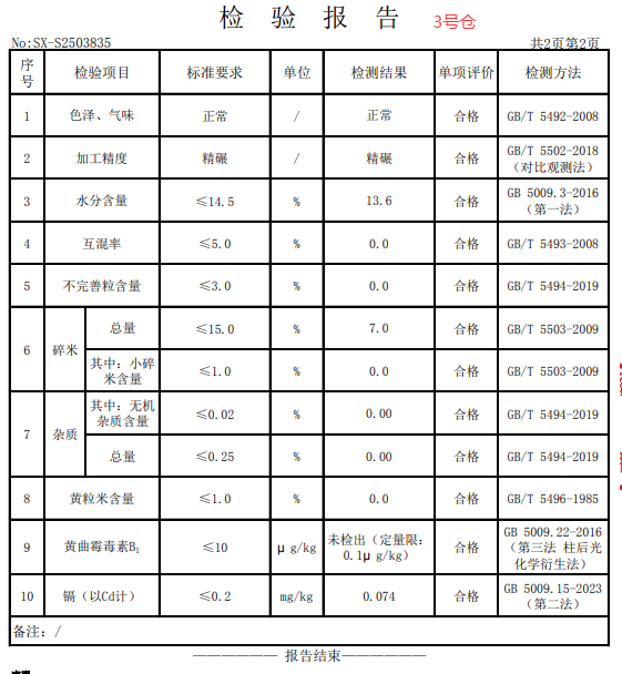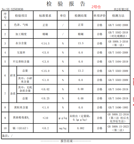 *.质量要求:杂质≤*.**、水分≤**.*、小碎米≤*.*、碎米总量≤**、矿物质≤*.**、黄粒米≤*.*、色泽、气味:正常,符合国标(** *********)一级籼米要求;卫生指标:符合食品安全国家标准(** *********),黄曲霉毒素**≤****/**,农药残留符合食品安全国家标准(** *********);重金属镉≤*.****/**,无机砷≤*.***/**,中标方需提供具有粮油产品检验资质的第三方检测机构检验合格报告、检验报告须随货同行。