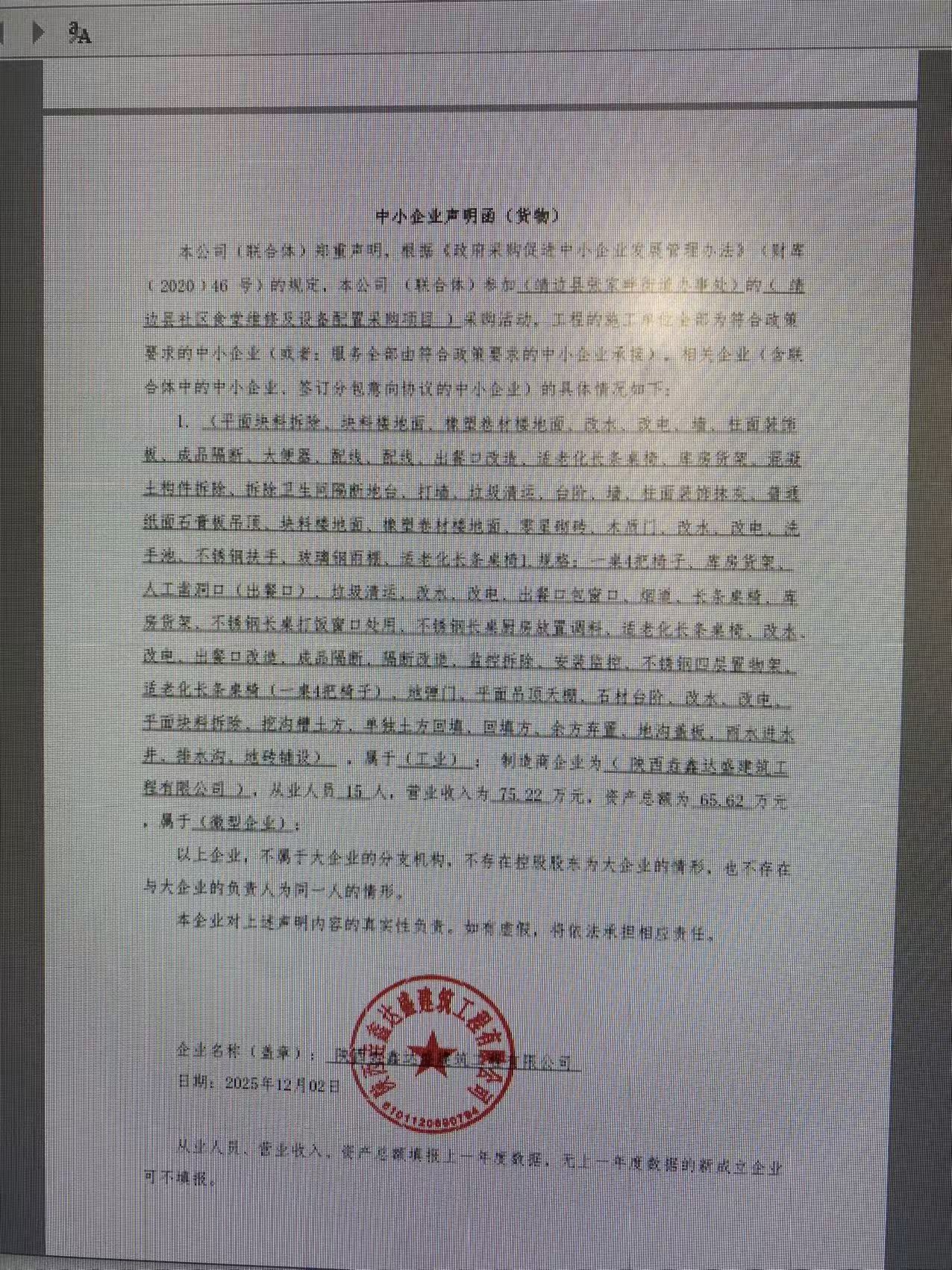 靖边县社区食堂维修及设备配置采购项目中标(成交)结果公告