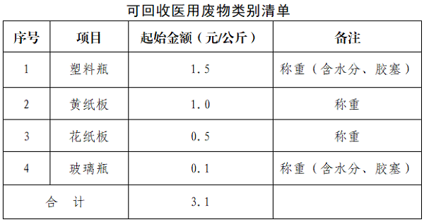 根据甘肃医学院附属医院《招标采购管理办法》规定,我院拟对以下项目进行竞价方式采购,欢迎符合资格条件的供应商前来参与。现将有关事项说明如下: 一、采购编号:*********** 二、采购项目:可回收医用废物回收处置项目 三、起始金额:*.*元/公斤(投标人总报价不得低于起始金额,否则视为无效报价,将取消投标资格) 四、服务需求: (一)服务内容 按采购人要求对全院各临床科室产生的可回收医用废物进行专业化收集、转运及处置服务。可回收医用废物包括:可回收且未被污染的塑料瓶、黄纸板、花纸板、玻璃瓶等,保障医院可回收医疗废物收集、转运、处置符合《中华人民共和国环境保护法》《医疗机构废弃物综合治理工作方案》(国卫医发〔****〕* 号)等国家及地方相关法律法规。 (二)服务要求 *.中标单位每日至少对全院可回收医用废物进行 * 次收集转运(日产日清),回收时间需避开医院就诊高峰期(具体时段由中标单位与各临床科室协商确定),不得影响医院正常医疗秩序。 *.设有专门的可回收医疗废物暂存、处置点,满足医院日产日清需求,严格遵循 “闭环管理、定点定向、全程追溯” 原则,规范开展可回收医用废物分类、投放、收集、贮存、交接、转运等工作,建立全程追溯台账(包括回收物品种类、数量、时间、交接人、回收人等信息,一式二份,临床科室与中标单位各执一份),每月底中标单位向采购人管理科室提交回收统计月报表。 *.中标单位须使用专用回收容器(张贴明显标识)及固定存储空间(符合环保及安全要求),配备专车专线进行拉运暂存,并指定专人负责管理。 *.回收人员须持有效健康证明经岗前培训合格后方可上岗,工作期间着装统一、整洁,遵守采购人院内各项管理制度,接受医院管理科室的检查与监督。 *.回收人员在收集、转运过程中,需采取防护措施保护医院的电梯、墙面、地面等设施设备,若因操作不当造成损坏,需在采购人规定时间内维修恢复至原样或按采购人核定金额照价赔偿。 *.可回收医疗废物由专人、专车、专线回收转运,并采用专用设备与技术进行无害化技术毁形。各类可回收医疗废物自中标单位从各临床科室拉出清运之日起,所有出现的法律责任均由中标单位承担。 *.中标单位不得接收任何属于医疗废物的物品,若发现可回收物品中混入医疗废物,需立即拒收或退还,由采购人按医疗废物管理规定处理。 *.回收利用的塑料瓶不得用于原用途;不得用于制造餐饮容器以及玩具等儿童用品;不得危害人体健康的原则。 *.中标单位需严格遵守《中华人民共和国环境保护法》《医疗机构废弃物综合治理工作方案》(国卫医发〔****〕* 号)等国家及地方相关法律法规,确保回收处置全流程合法合规,若因中标单位违规操作导致采购人受到处罚或产生损失,由中标单位承担全部责任及赔偿。 **.服务期间,须确保工作人员及第三方人员人身及财产安全,若发生安全事故或造成重大人员伤亡,均由中标单位负责,给采购人造成的一切损失,由中标单位负责赔偿。 (三)服务期限:*年,自合同签订之日起计算。 (四)服务地点:甘肃医学院附属医院(平凉市人民医院)指定地点 (五)付款方式:半年结算一次,以项目中标单价*回收总数量,据实结算,回收费用向医院规划财务科缴纳入账。 五、供应商资格要求: (一)满足《中华人民共和国政府采购法》第二十二条规定: *.具有独立承担民事责任的能力(须提供有效的营业执照、组织机构代码证、税务登记证、三证合一只需提供营业执照副本); *.具有履行合同所必需的设备和专业技术能力(需提供证明材料); *.须提供近*个月内任意*个月的纳税凭证(依法免税的应提供证明资料)和缴纳社会保险凭证的证明资料; *.参加本次政府采购活动近三年内,在经营活动中没有重大违法记录(需提交企业声明函原件); (二)本项目的特定资格要求: *.提供法定代表人资格证明、法人身份证复印件(法定代表人参与投标时提供);或法人授权函、被授权人身份证复印件(非法定代表人参与投标时提供); *.须有信用中国网站(***.***********.***.**)、中国政府采购网(***.****.***.**)、*个网站的查询结果截图。如相关记录已失效,供应商需提供相关证明资料)。 *.须具备市地以上地方人民政府生态环境主管部门颁发的排污许可证;并在环保局备案。 (三)本项目不接受联合体投标。 六、招标文件获取: 从即日起至****年**月**日**:**前登录甘肃医学院附属医院(平凉市人民医院)官网获取竞价公告,按要求准备相应资料(正本一份)并胶装成册,密封盖章后邮寄至甘肃省平凉市崆峒区崆峒东路***号甘肃医学院附属医院(平凉市人民医院)行政办公楼*楼***室。 七、开标时间及地点: 时间:****年**月**日**:** 地点:甘肃医学院附属医院(平凉市人民医院)行政办公楼*楼会议室 八、报价方式: 投标人按照可回收医用废物类别清单报价,即在竞价有效期内单价固定不变,其投标报价均包括本项目可能发生的服务费、人工、运输、设施设备、处置清运、管理费、利润、税金、保险及各类相关风险等所有相关费用。 九、评审方法: 竞价成交原则:竞价小组按竞价公告和投标人提供的响应文件评审,在资质条件、服务需求均满足的同等条件下,以不低于底价的最高报价者为竞得人,如在限时竞价内只有一个竞买人报价且不低于底价,成交。无人报价或者竞买人报价