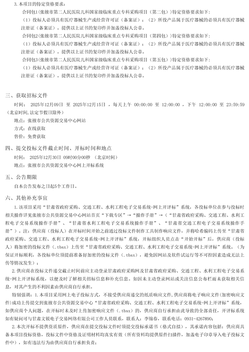 张掖市第二人民医院儿科国家级临床重点专科采购项目(二次)第二包、第四包、第五包采购/资审公告