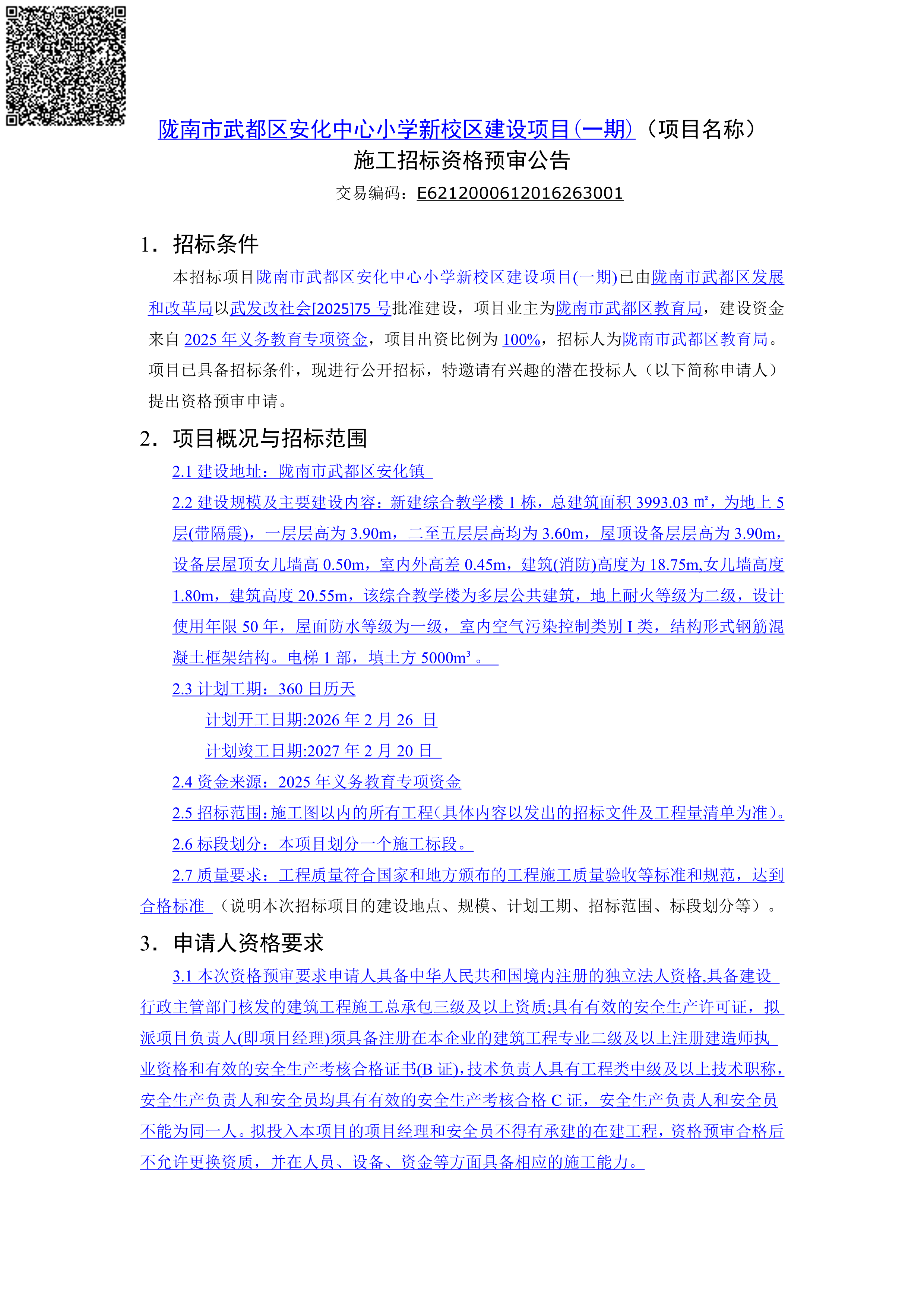 陇南市武都区安化中心小学新校区建设项目(一期)(项目名称)施工招标资格预审公告