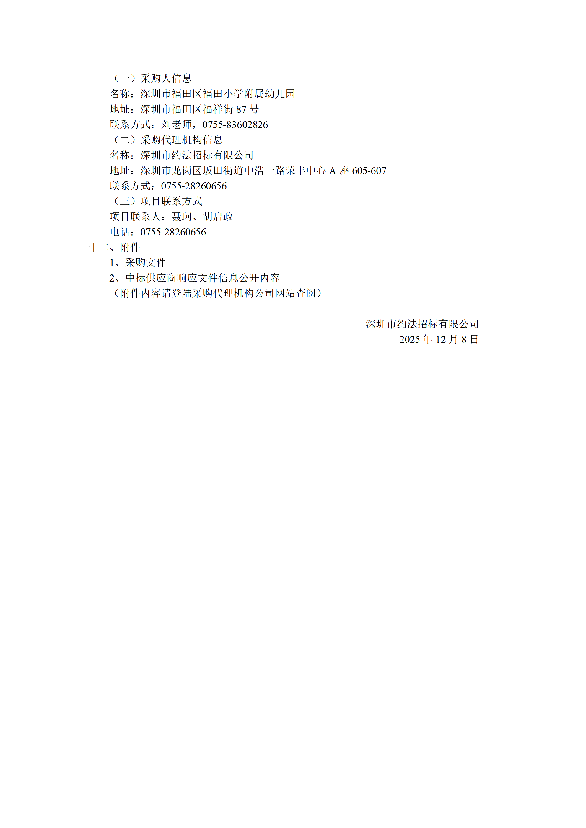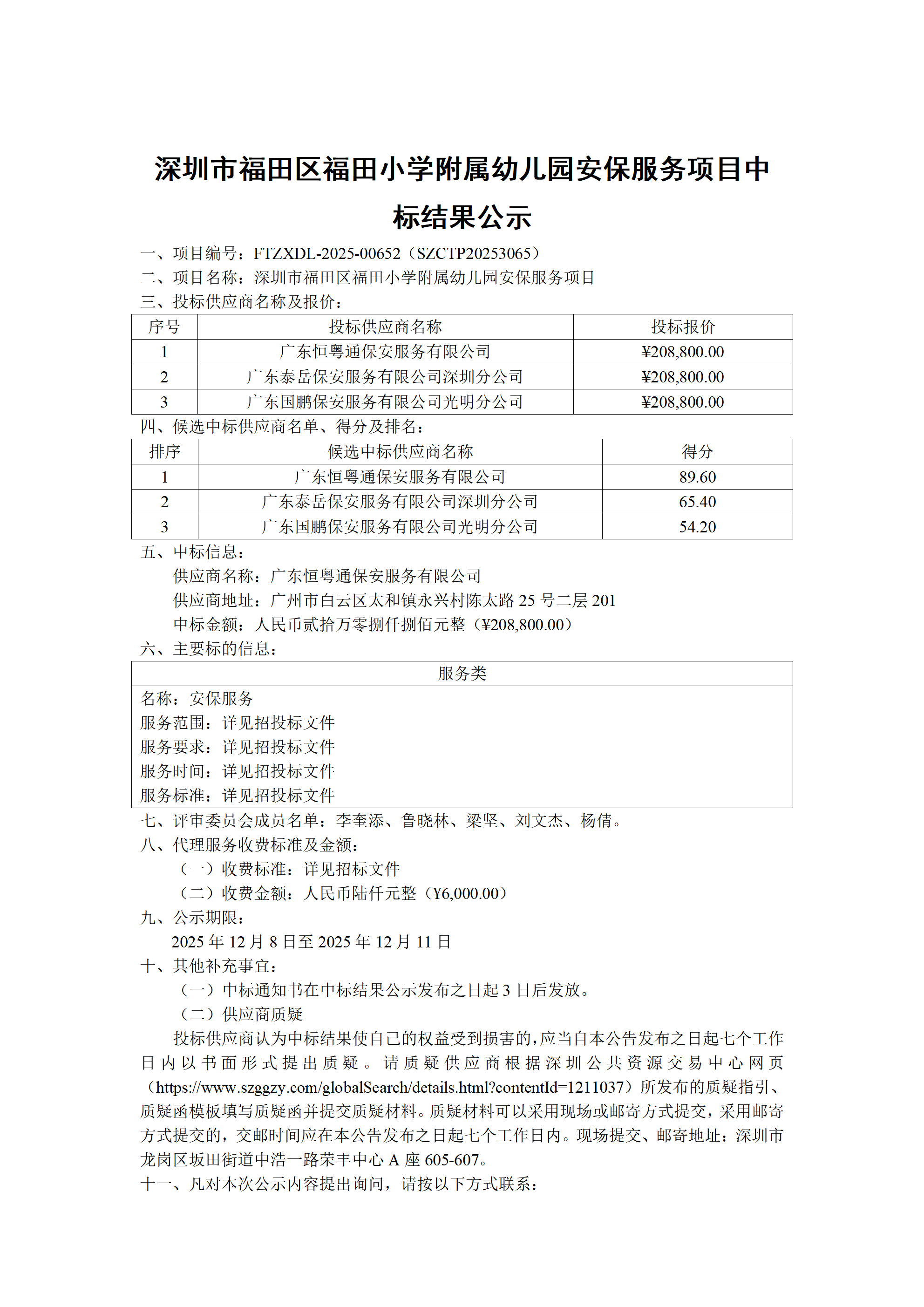 6深圳市福田区福田小学附属幼儿园安保服务项目的采购结果公告