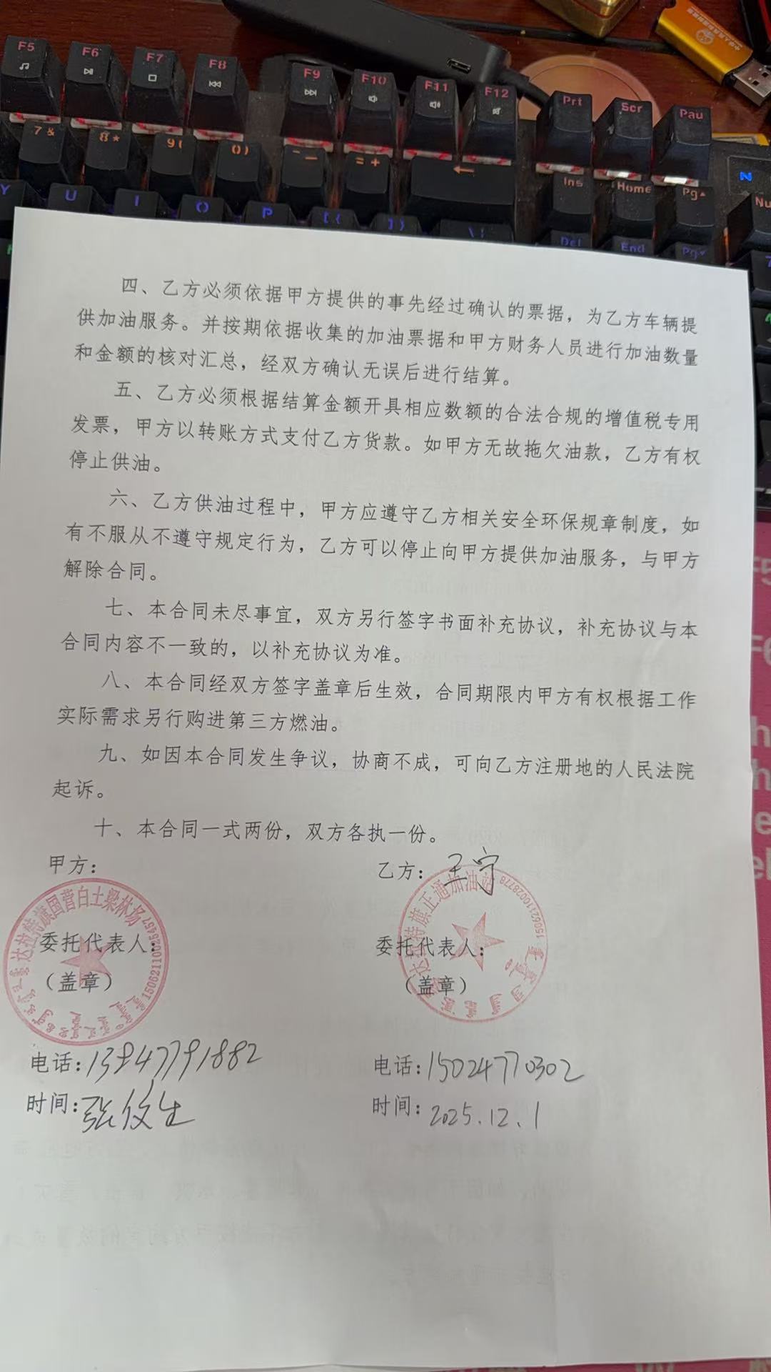 一、合同编号:***二、合同名称:加油项目三、项目编号:鄂财购备字(电子)[****]*******号四、项目名称:加油项目五、合同主体采购人(甲方):达拉特旗国营白土梁林场 地址:鄂尔多斯市达拉特旗 联系方式:*********** 供应商(乙方):达拉特旗正通加油站 地址:内蒙古自治区鄂尔多斯市达拉特旗树镇***国道东**公里处 联系方式:*********** 六、合同主要信息主要标的: