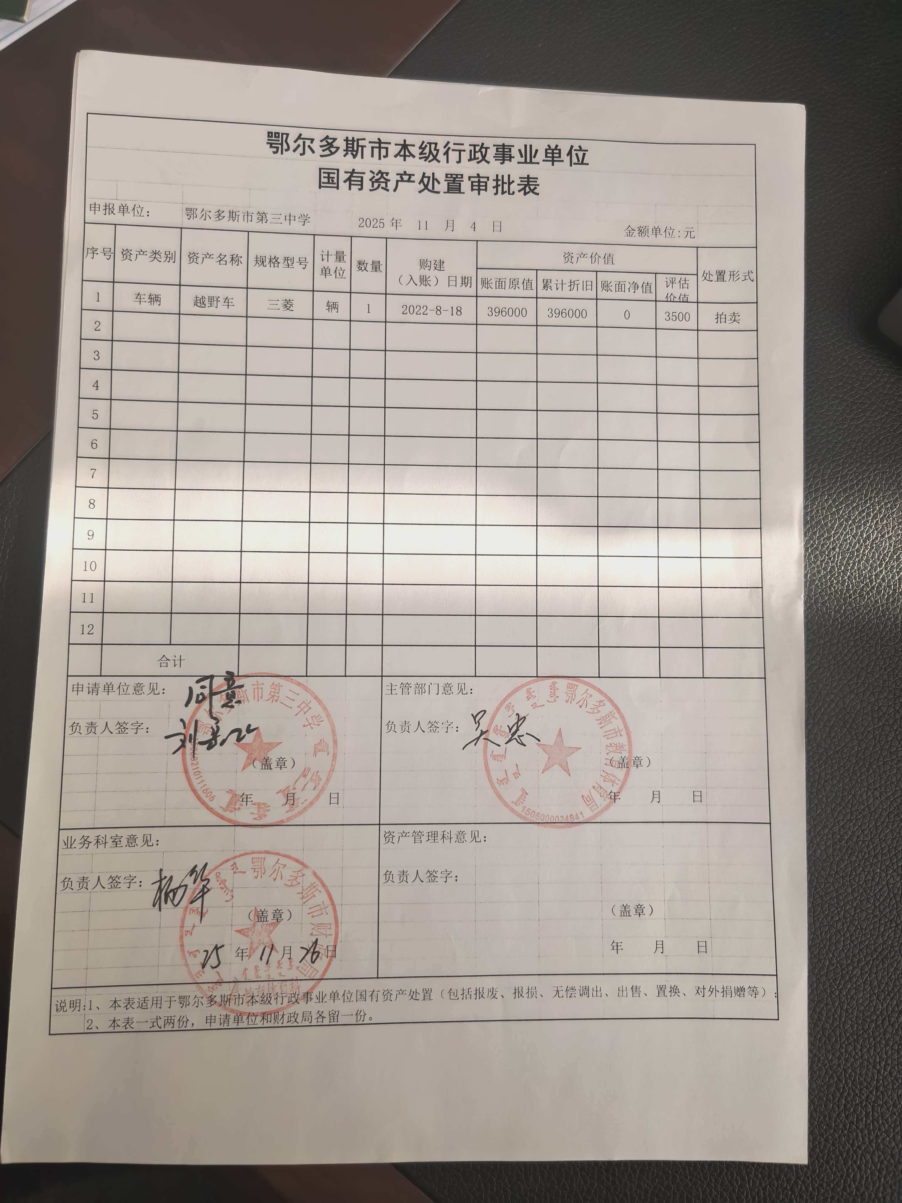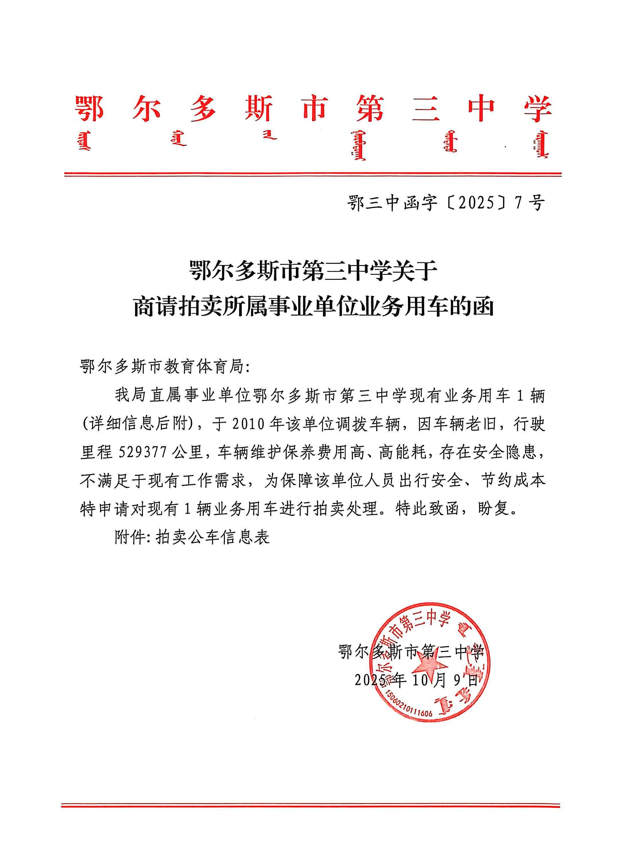 鄂尔多斯市第三中学车辆转让网上拍卖交易公告
