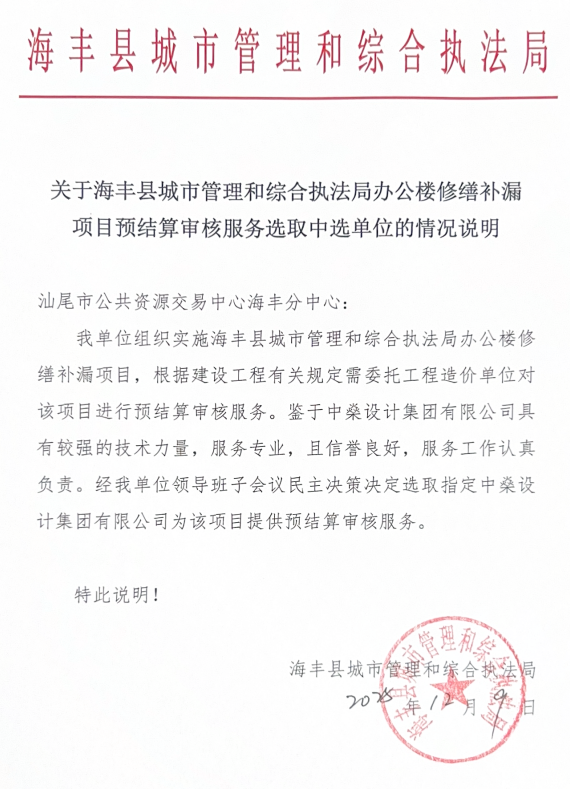 关于【海丰县城市管理和综合执法局办公楼修缮补漏项目预结算审核服务】中选结果的公告