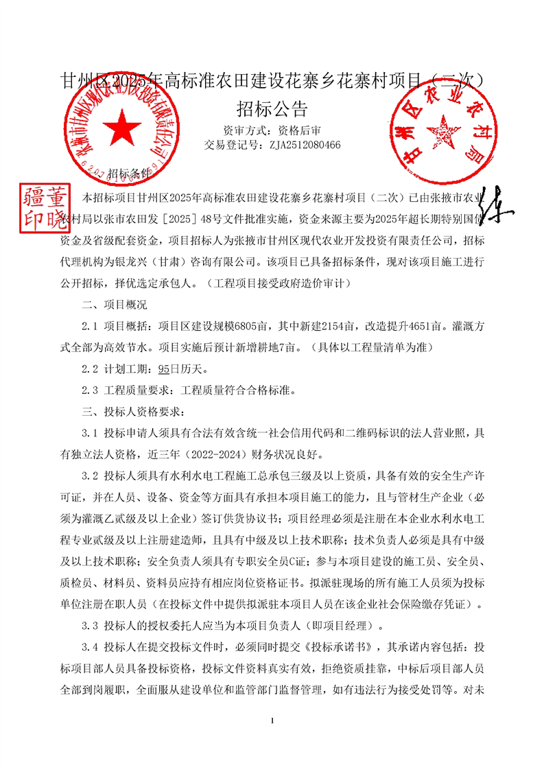 甘州区2025年高标准农田建设花寨乡花寨村项目(二次)招标/资审公告