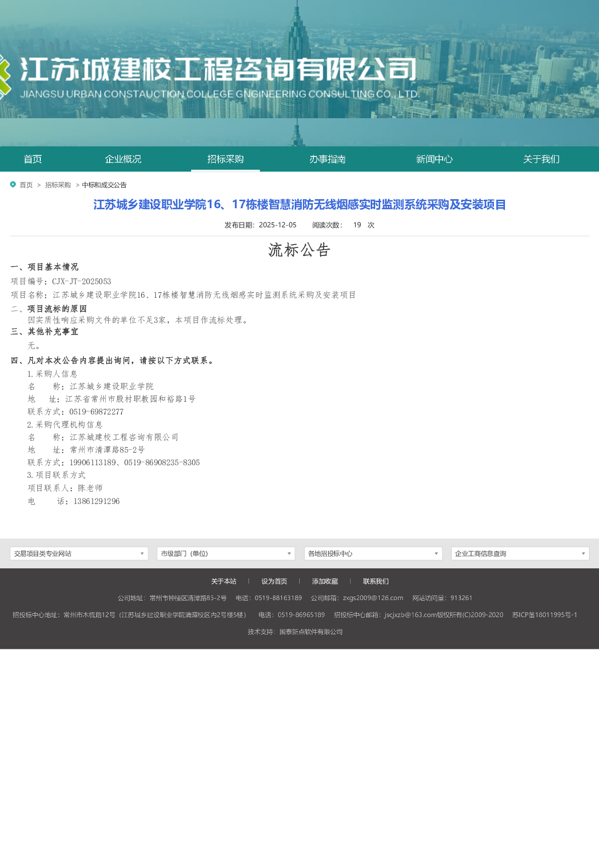 江苏城乡建设职业学院16、17栋楼智慧消防无线烟感实时监测系统采购及安装项目流标公告