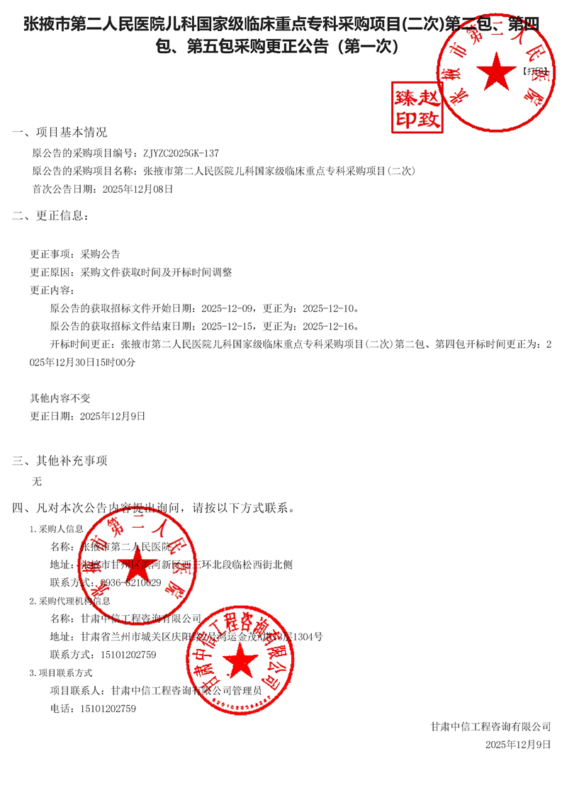 张掖市第二人民医院儿科国家级临床重点专科采购项目(二次)第二包、第四包、第五包更正事项