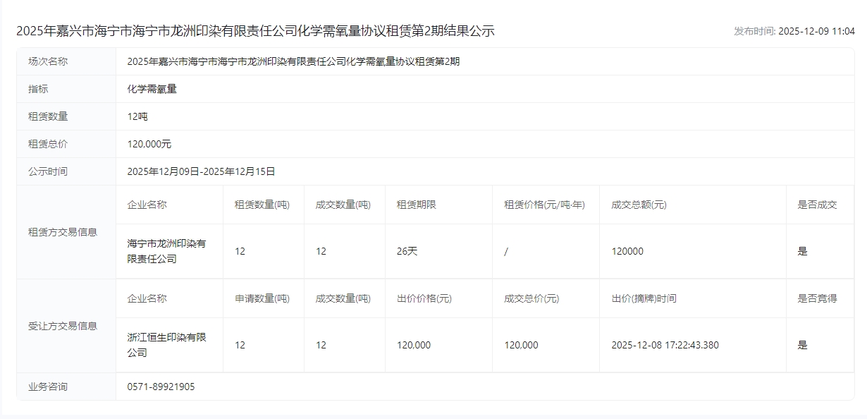 龙洲印染有限责任公司化学需氧量协议租赁第2期结果公示成交公示