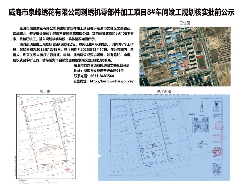 绣花有限公司刺绣机零部件加工项目*#车间竣工规划核实批前公示