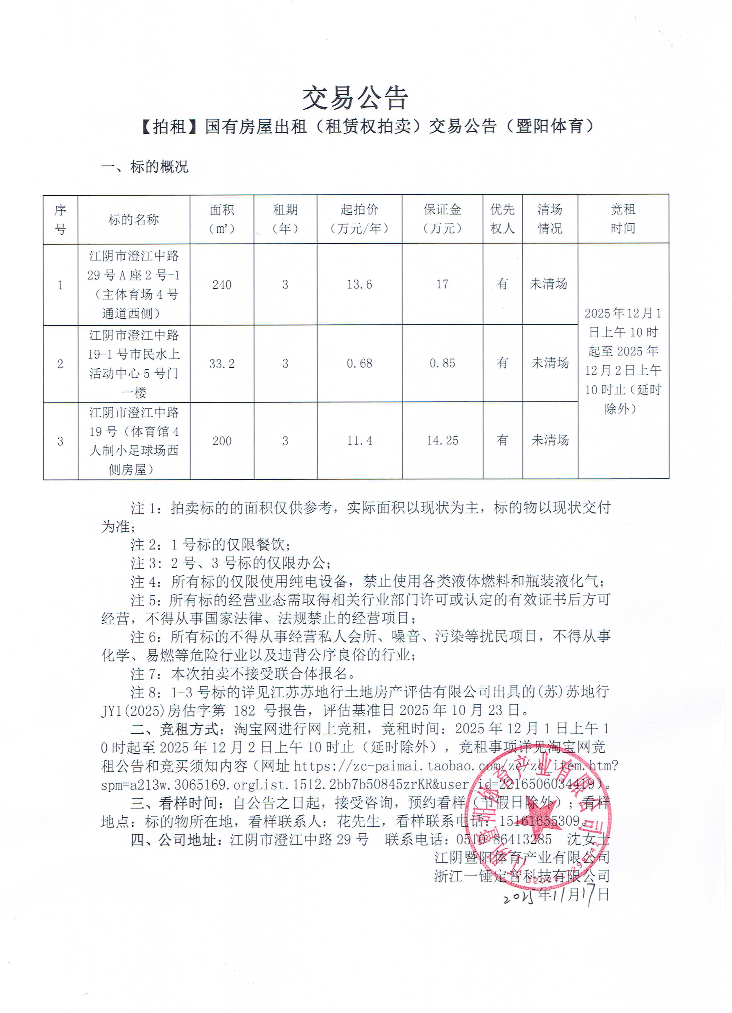 【拍租】国有房屋出租(租赁权拍卖)交易公告(暨阳体育)