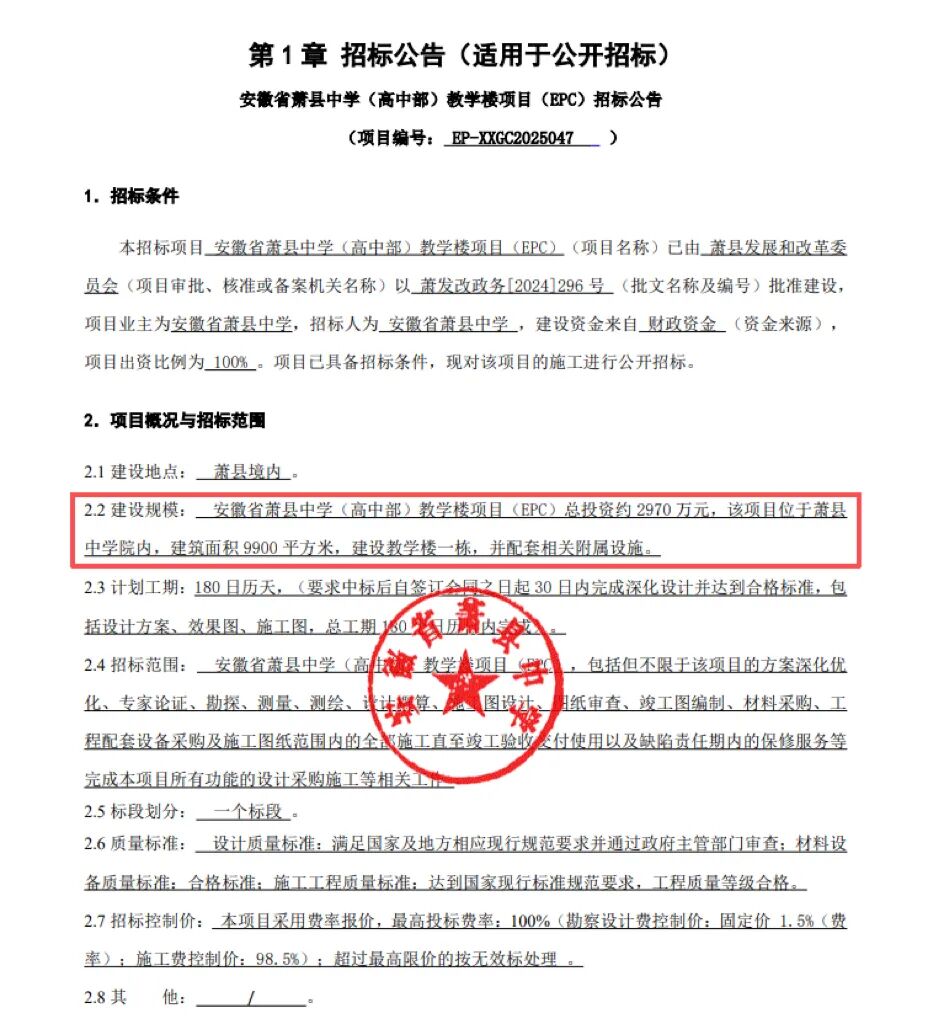 安徽省萧县中学(高中部)教学楼项目(EPC)中标候选人公示