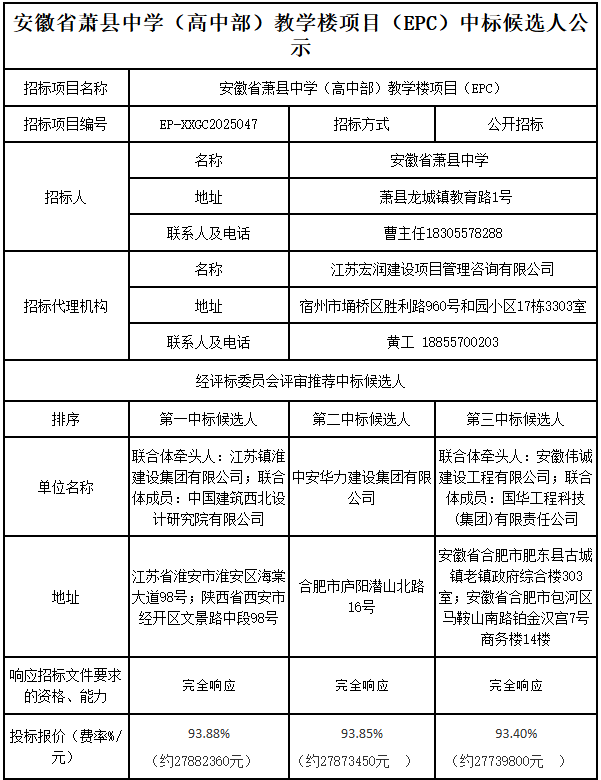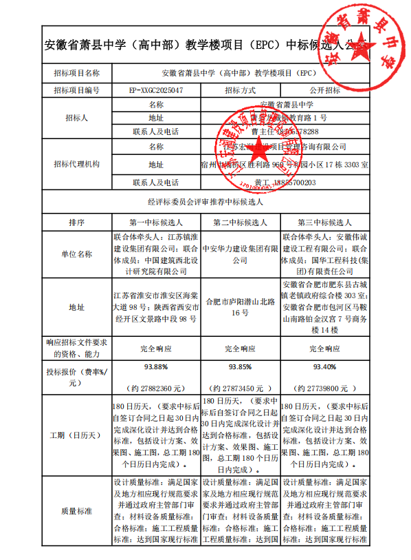 安徽省萧县中学(高中部)教学楼项目(***)中标候选人公示