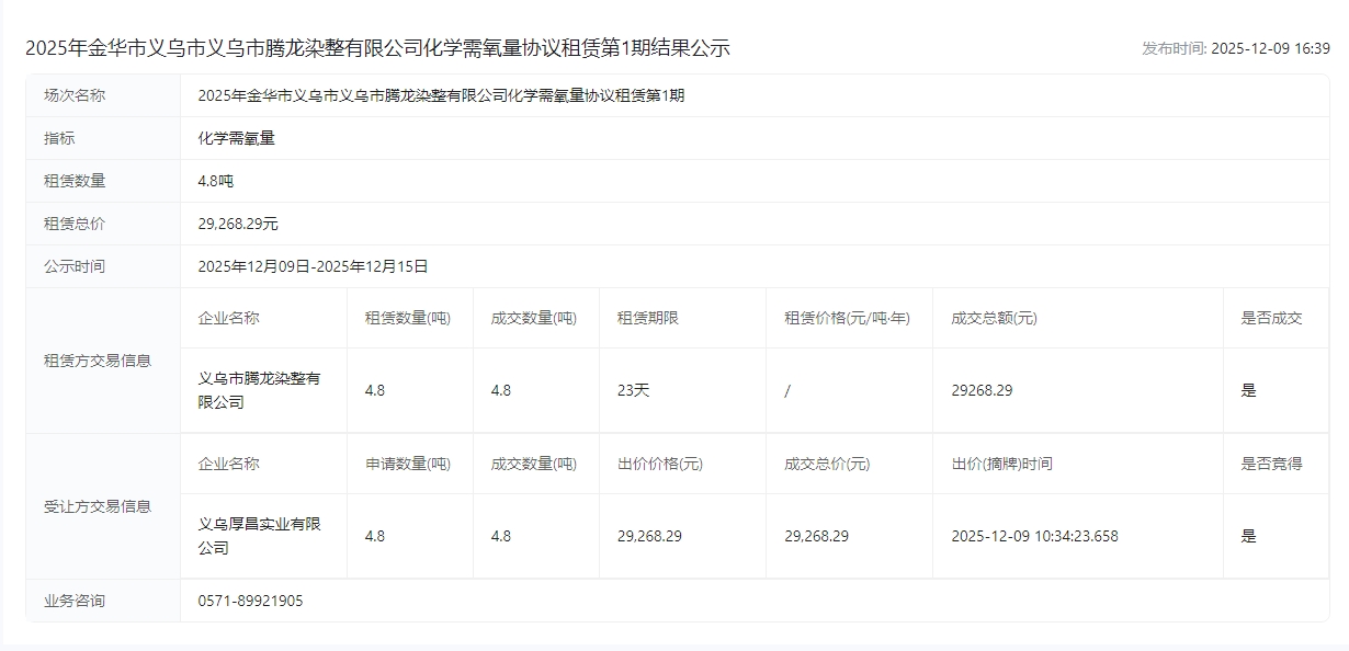 染整有限公司化学需氧量协议租赁第1期结果公示