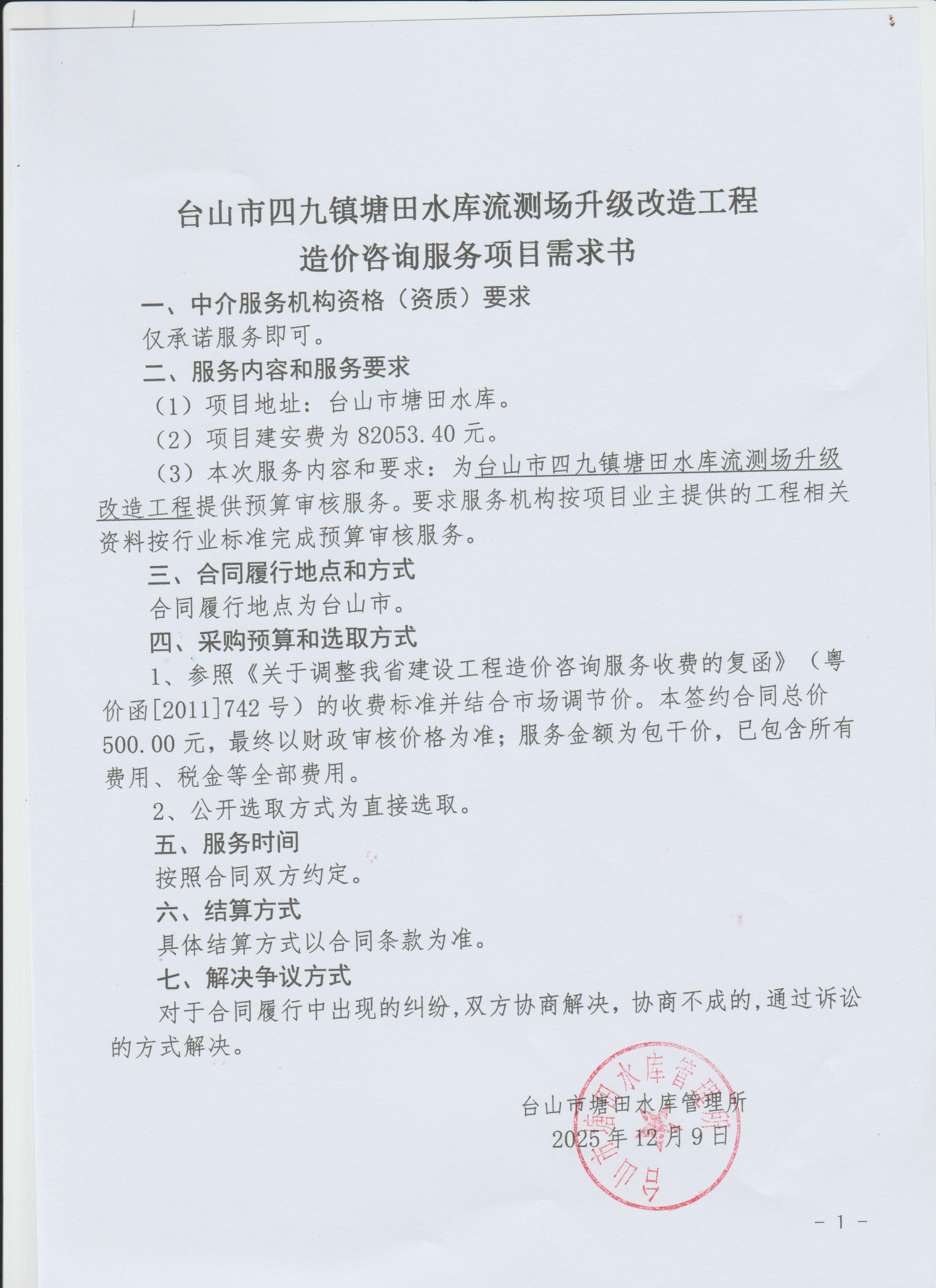 (*)项目地址:台山市塘田水库。 (*)项目建安费为*****.**元。 (*)本次服务内容和要求:为台山市四九镇塘田水库流测场升级改造工程提供预算审核服务。要求服务机构按项目业主提供的工程相关资料按行业标准完成预算审核服务。