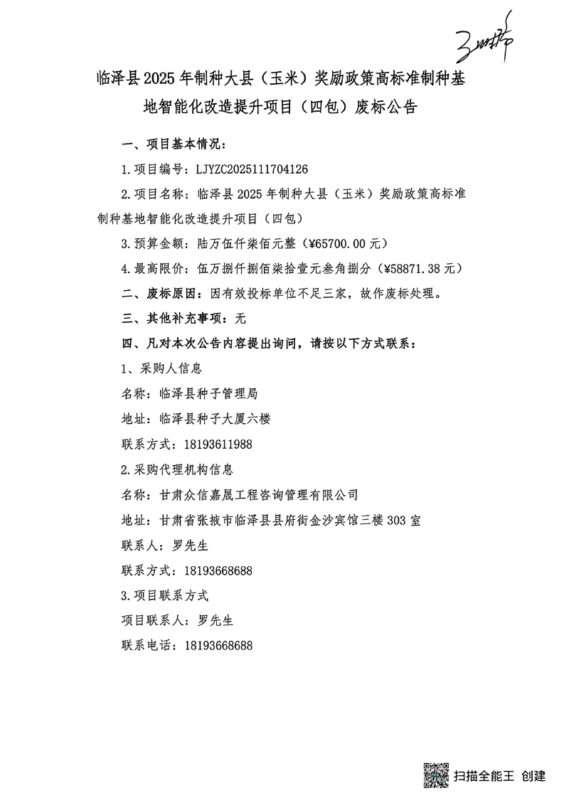 【废标公告】临泽县**** 年制种大县(玉米)奖励政策高标准制种基地智能化改造提升(六包)废标公告