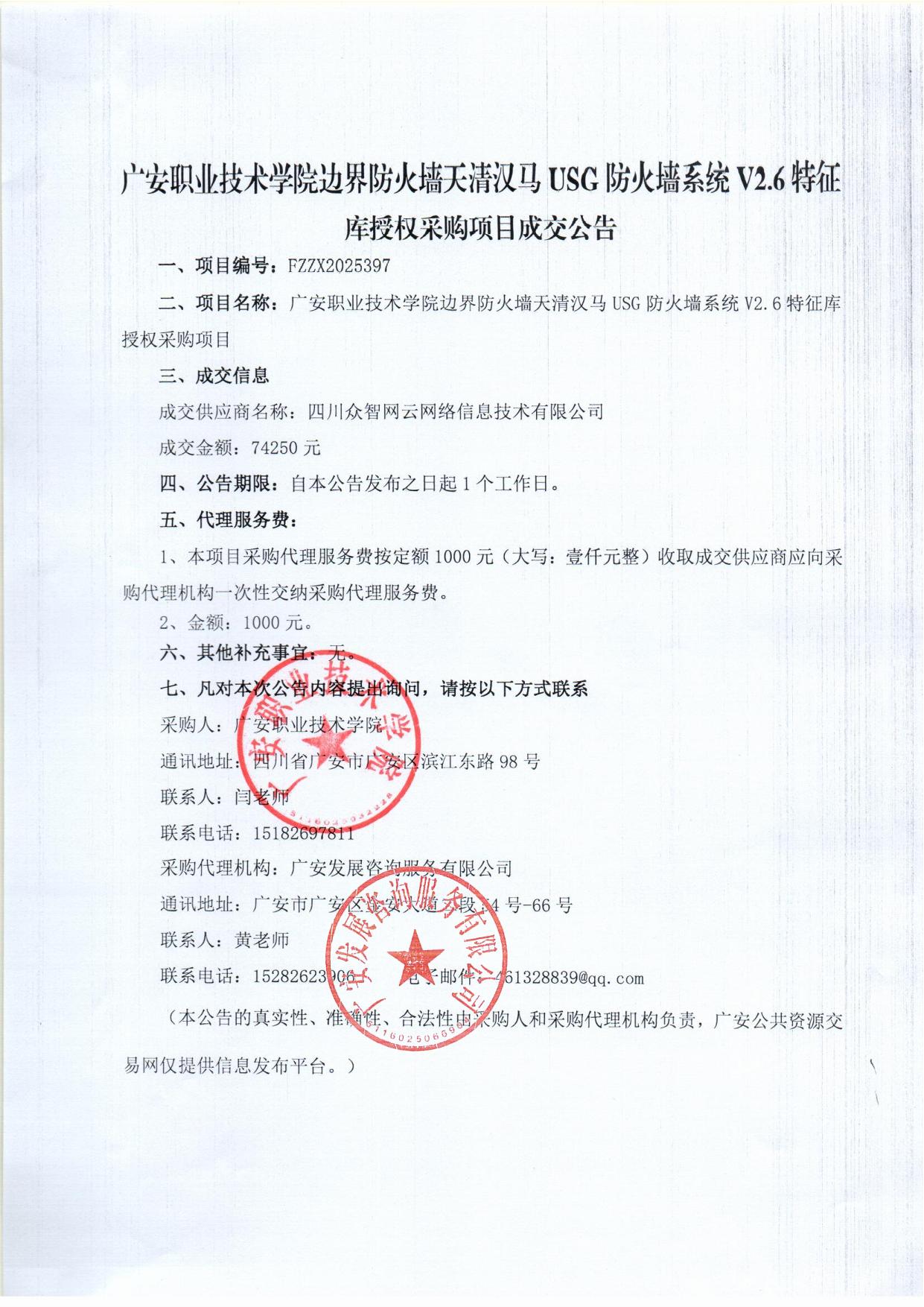 广安职业技术学院边界防火墙天清汉马USG防火墙系统V2.6特征库授权采购项目