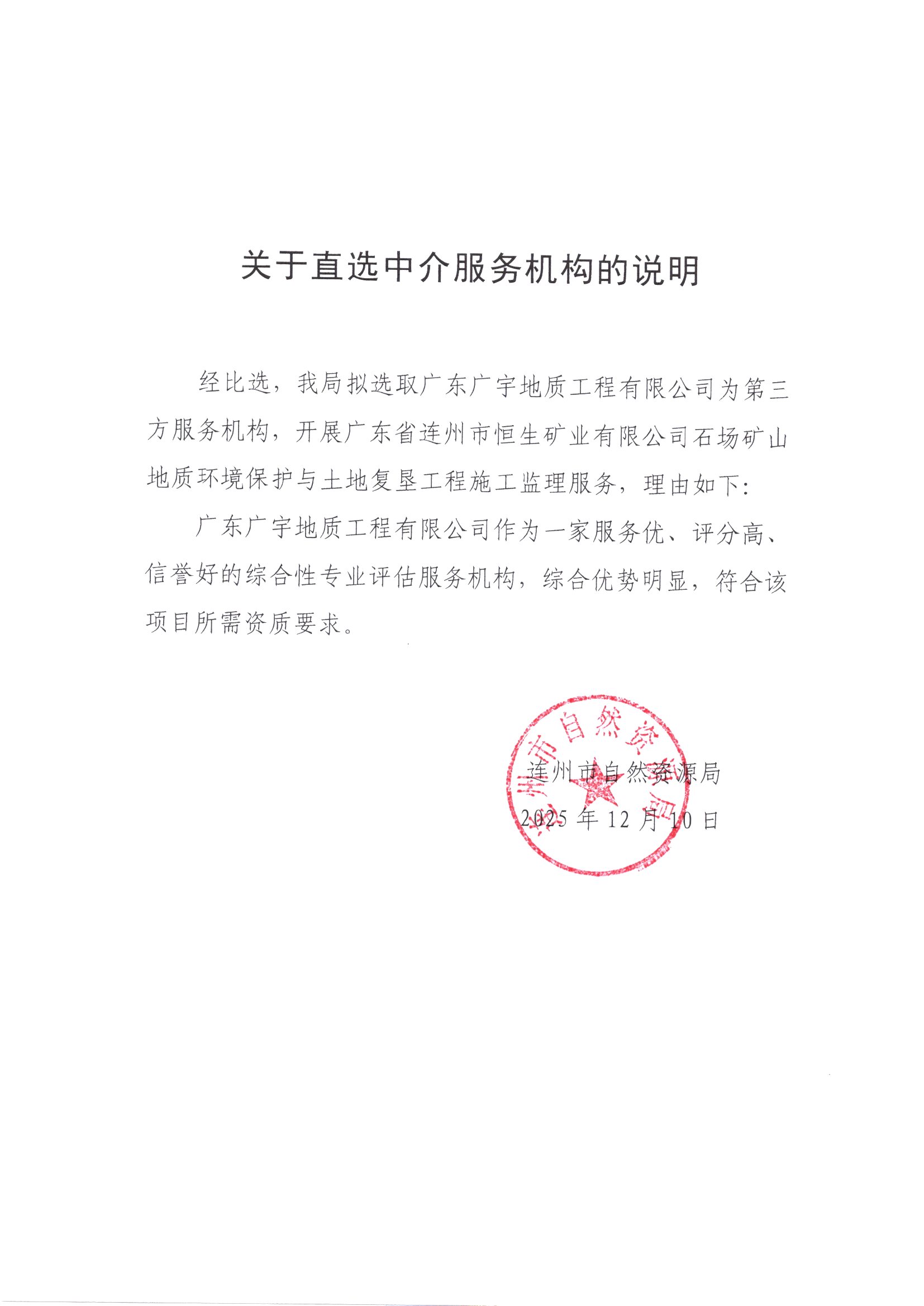 广东省连州市恒生矿业有限公司石场矿山地质环境保护与土地复垦工程施工监理服务中选公示