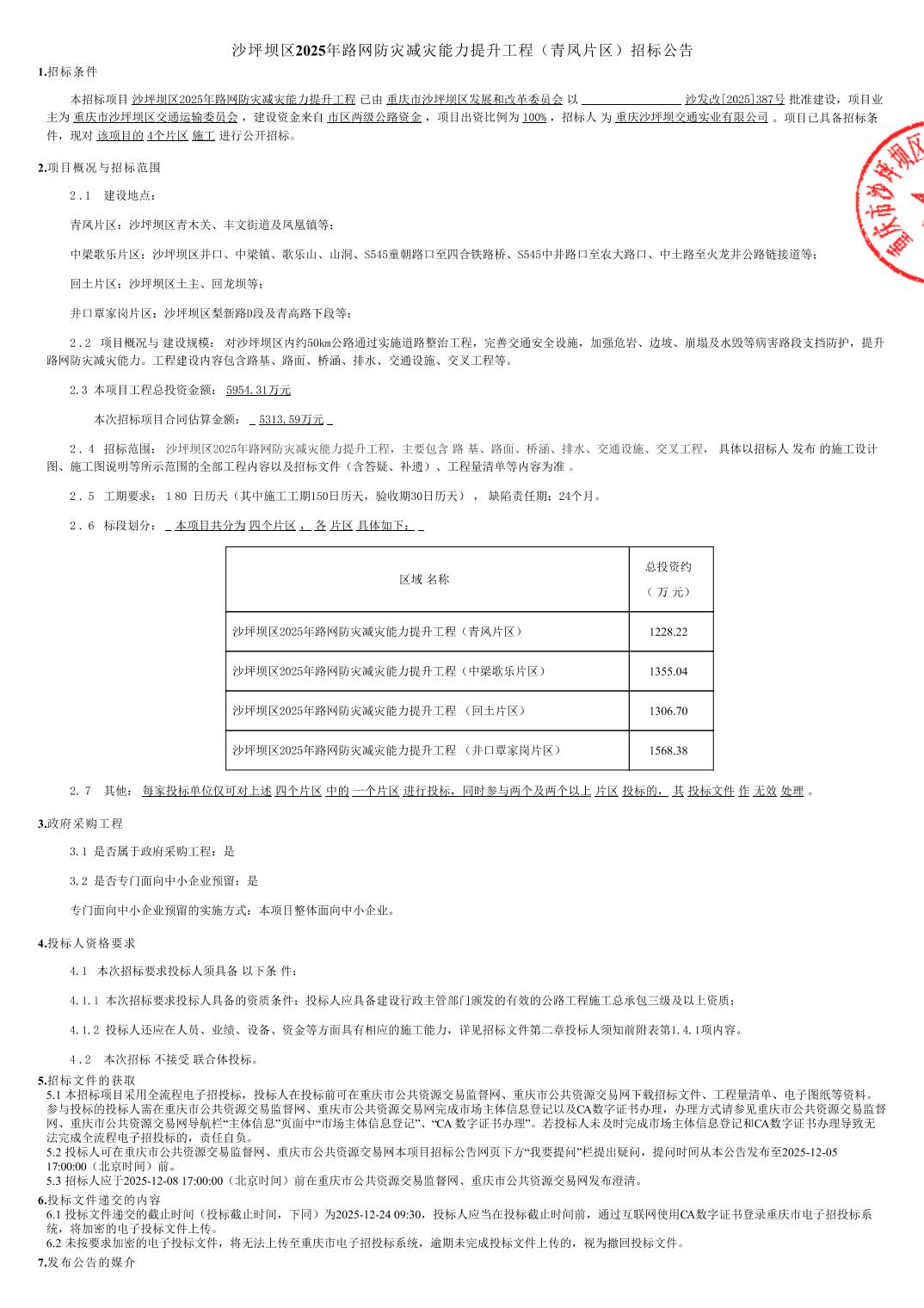 沙坪坝区2025年路网防灾减灾能力提升工程(青凤片区)招标公告