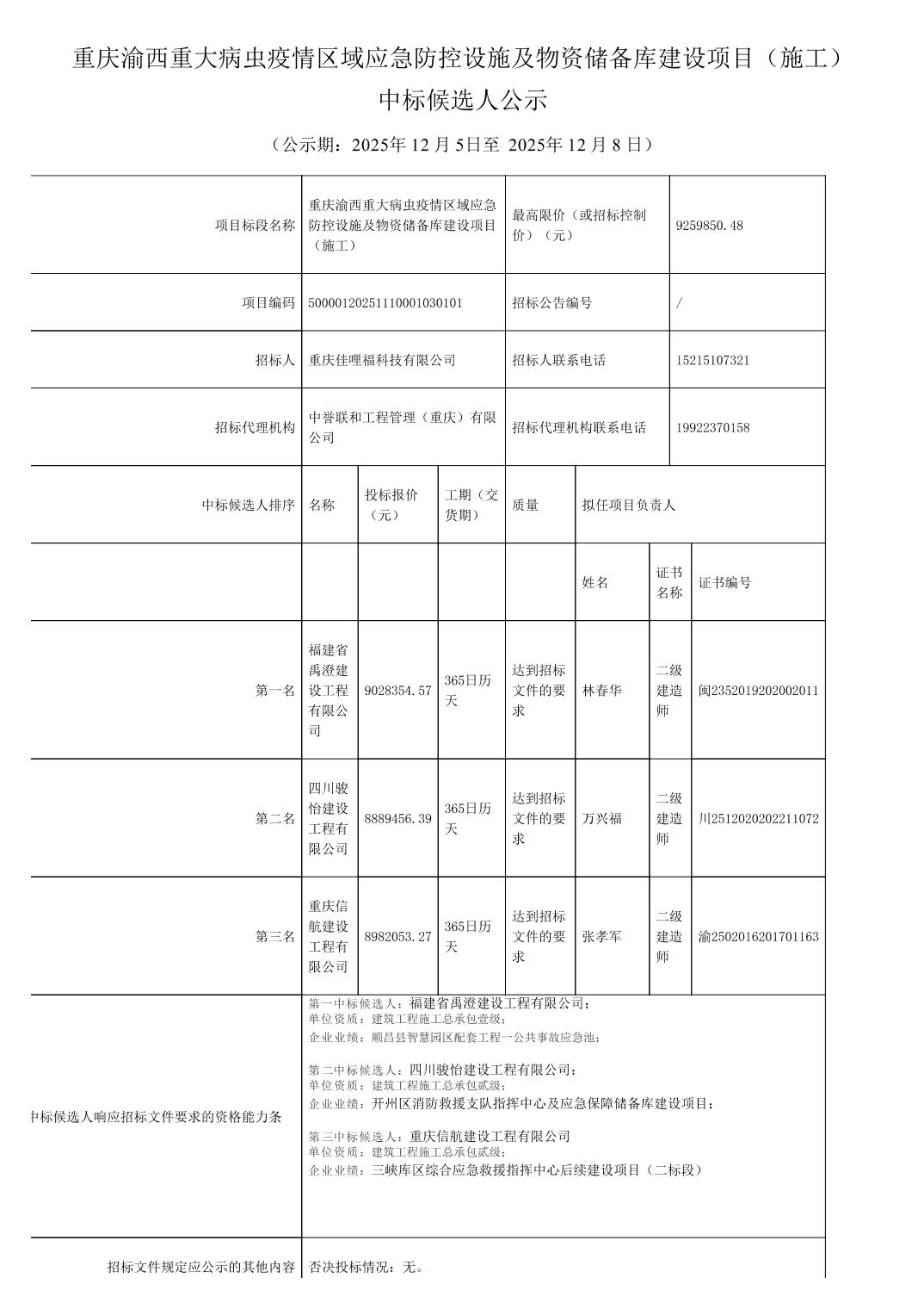 重庆渝西重大病虫疫情区域应急防控设施及物资储备库建设项目(施工)中标候选人公示