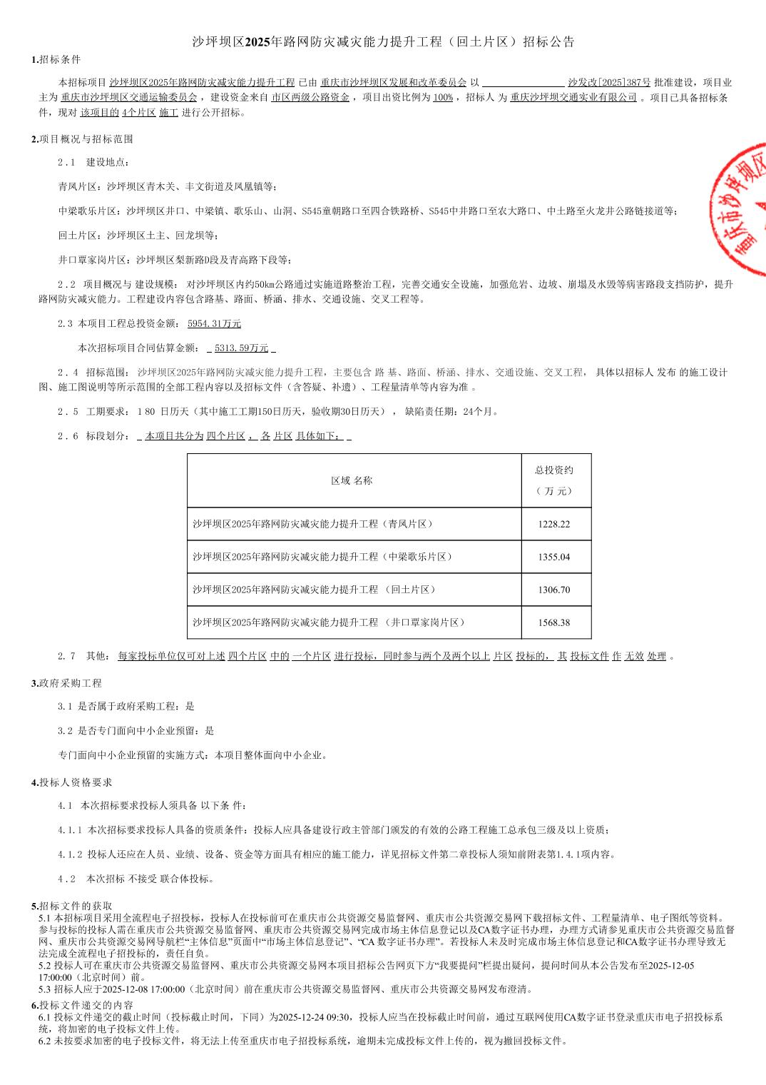 沙坪坝区2025年路网防灾减灾能力提升工程(回土片区)招标公告