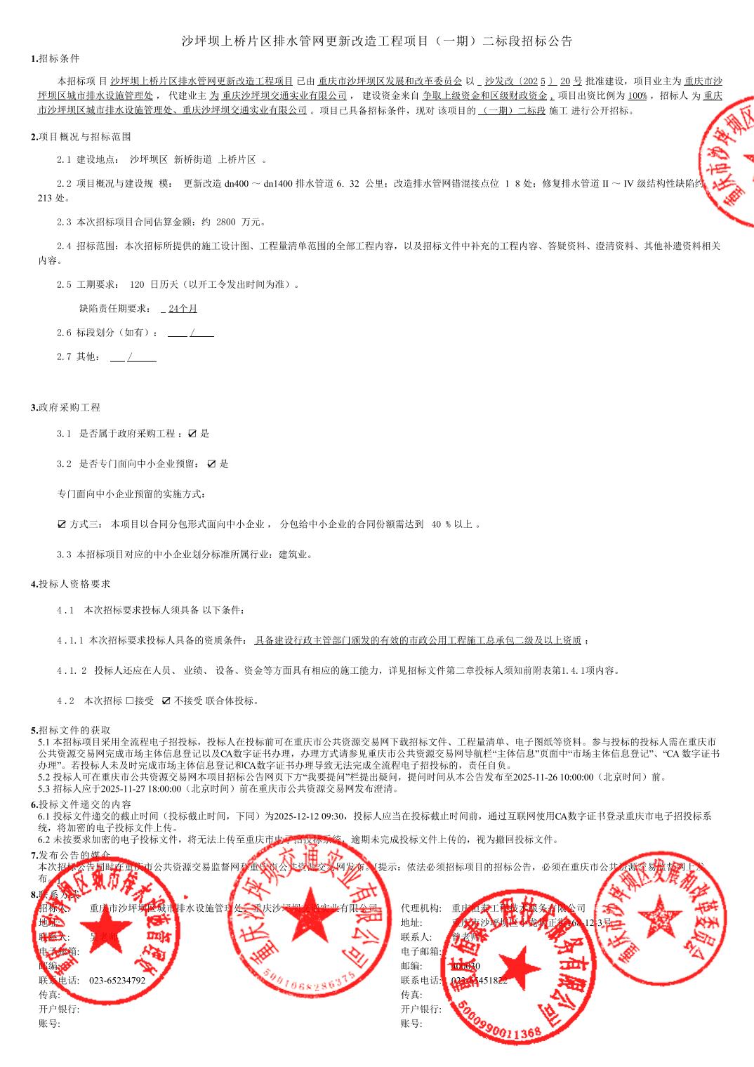 沙坪坝上桥片区排水管网更新改造工程项目(一期)二标段招标公告