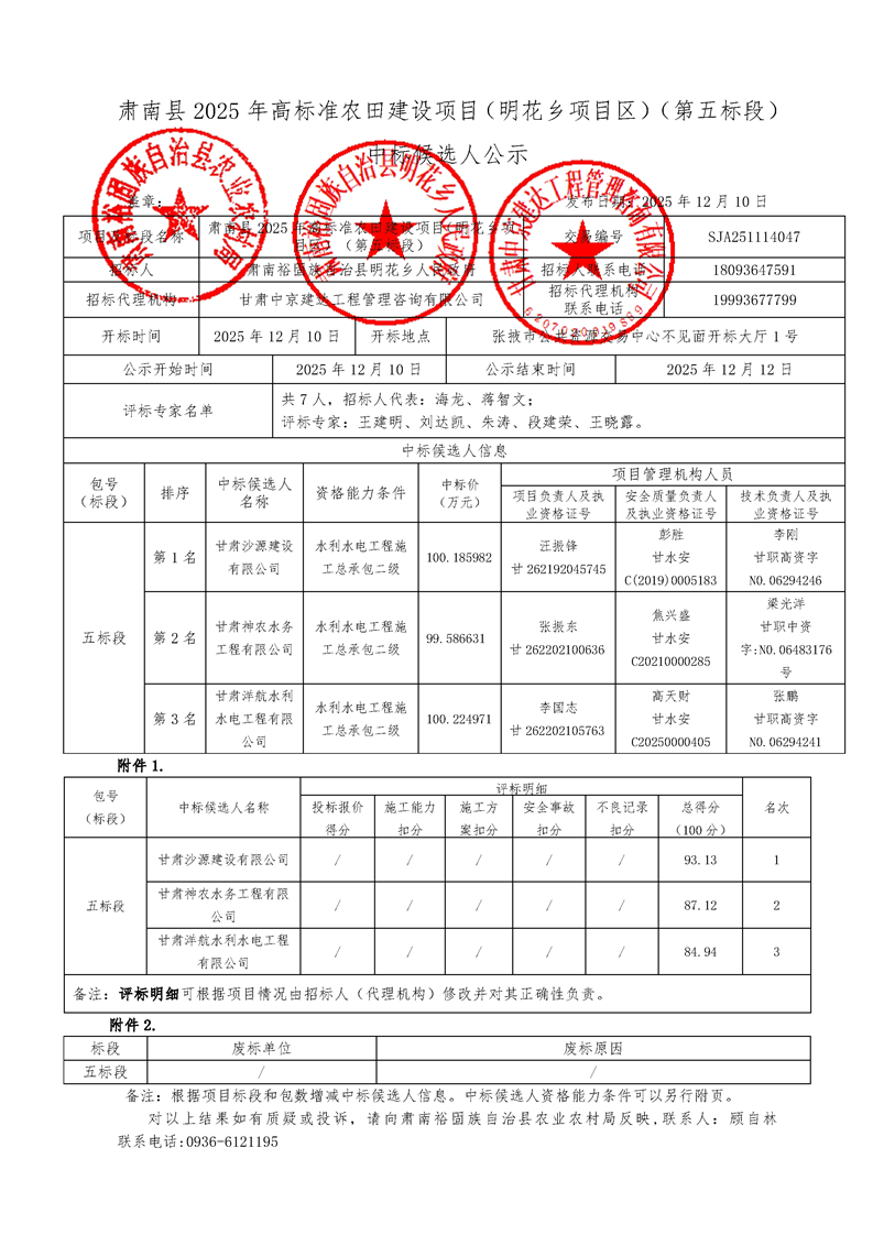 [肃南县]肃南县2025年高标准农田建设项目(明花乡项目区)第五标段中标候选人公示交易结果公示