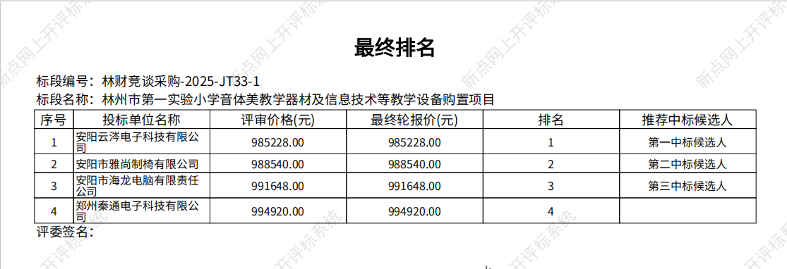 林州市第一实验小学音体美教学器材及信息技术等教学设备购置项目成交结果公告