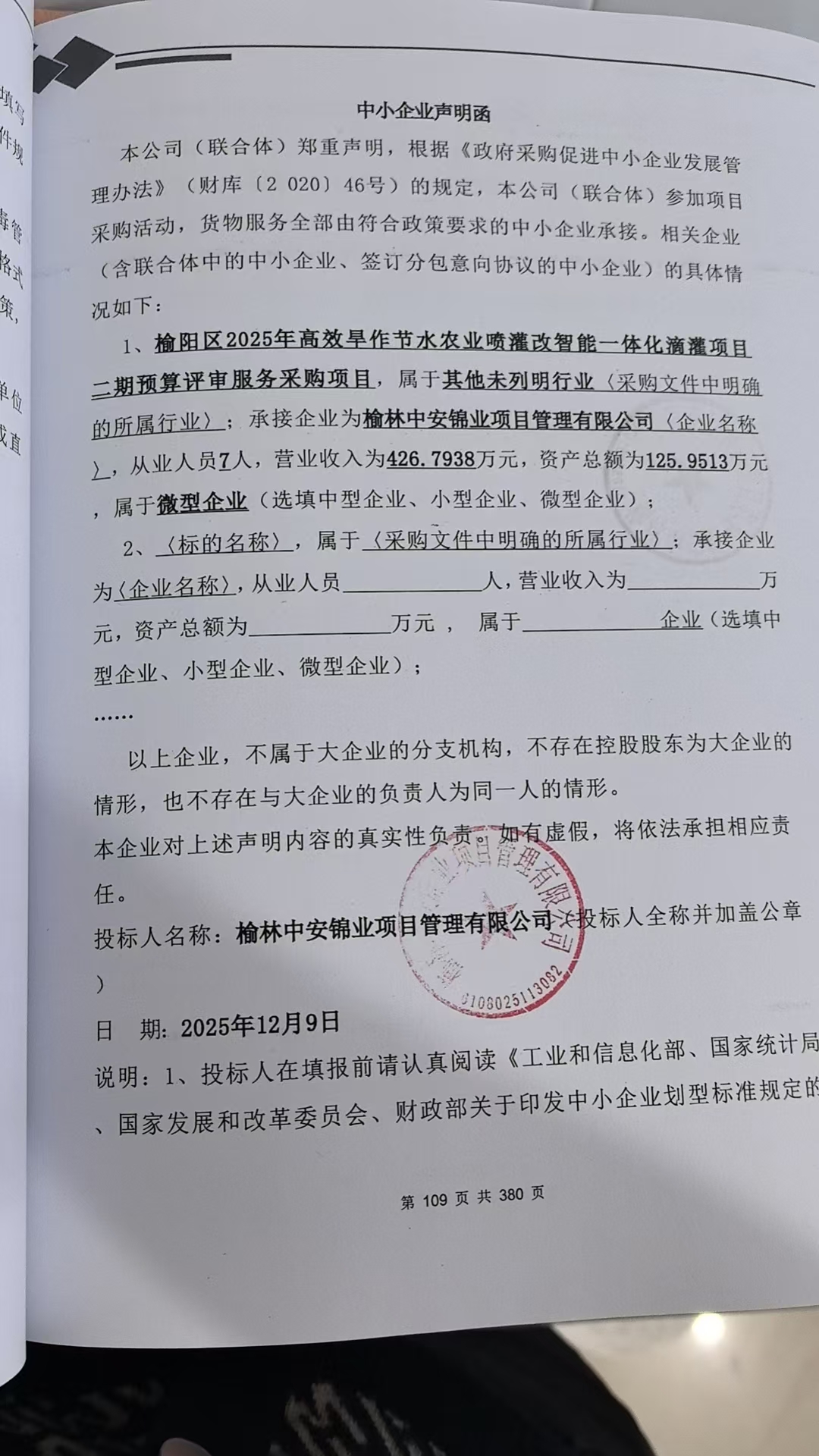 榆林市榆阳区财政资金评审评价中心榆阳区2025年高效旱作节水农业喷灌改智能一体化滴灌项目二期预算评审服务中标(成交)结果公告