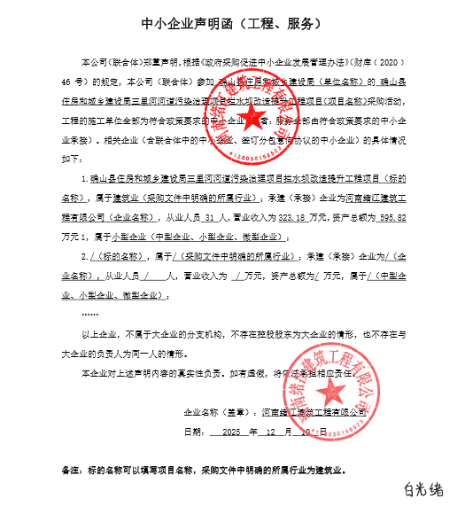 | *、采购项目名称:确山县住房和城乡建设局三里河河道污染治理项目拦水坝改造提升工程项目 | |||||||||||||||||||||||||||||||