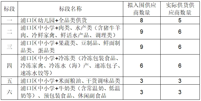 为规范浦口区中小学、幼儿园食堂食材采购管理,保障约**所学校的餐饮供应,现通过公开招标方式择优选择食材供应商。本项目涵盖食材包括但不限于乳制品、豆制品、调味品、粮油、蔬菜、水果、冷鲜肉、水产品、冷冻制品及禽蛋等。本次项目共分为六个标段,标段划分及各标段入围供应商数量如下: