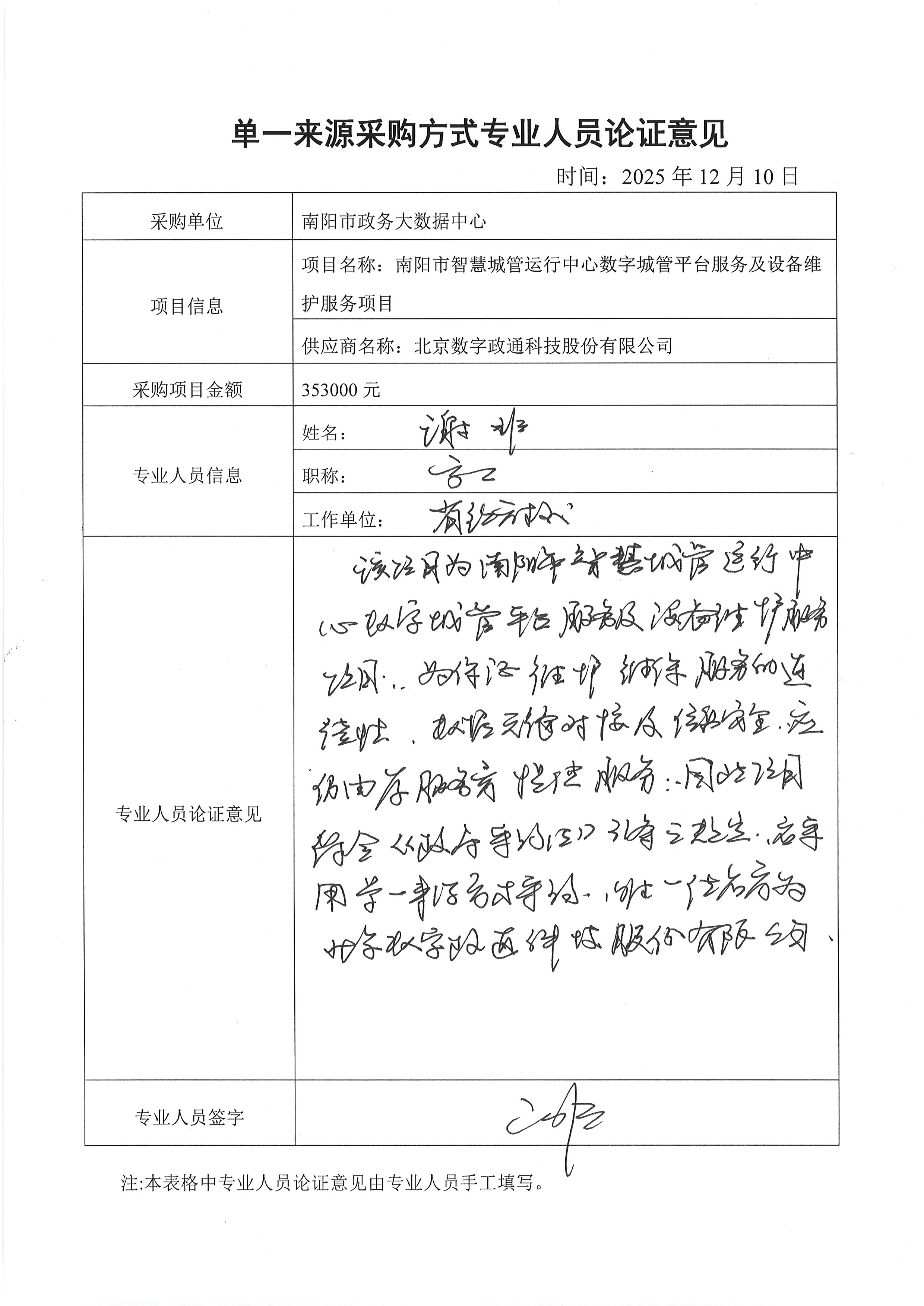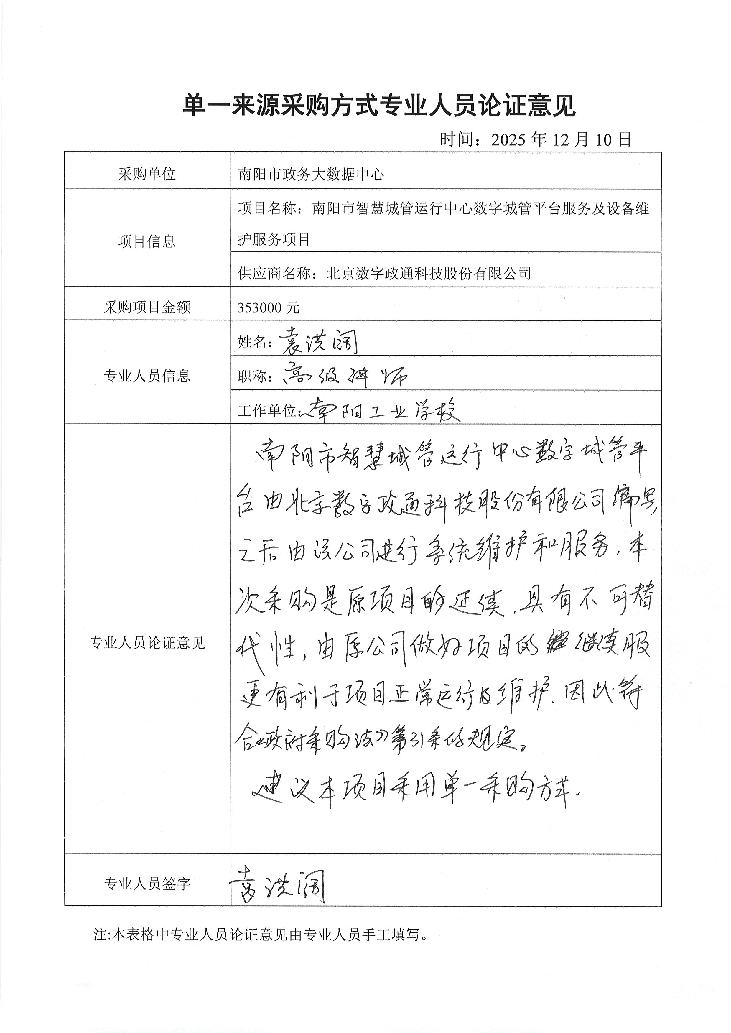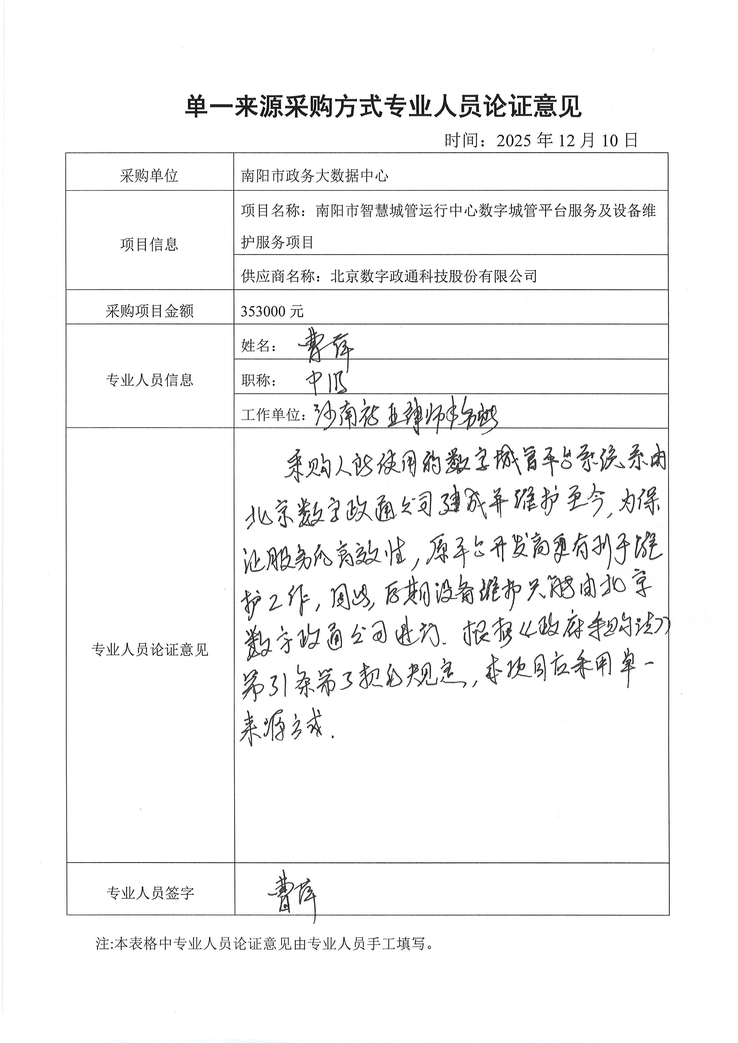 | 南阳市智慧城管运行中心数字城管平台是全市政务信息化的重要基础设施,现正在使用的系统软硬件是北京数字政通科技股份有限公司提供的,原系统平台开发商对系统源代码熟悉,操作级别最高,更有利于高效完成维护工作,因此后期设备维护工作只能由原系统公司完成。经论证小组详细讨论,该项目具有唯一性。根据《中华人民共和国政府采购法》第三十一条第三款“必须保证原有采购项目一致性或者服务配套的要求………”相关要求,建议采购人采用单一来源采购方式。 | ||||||||||||||||