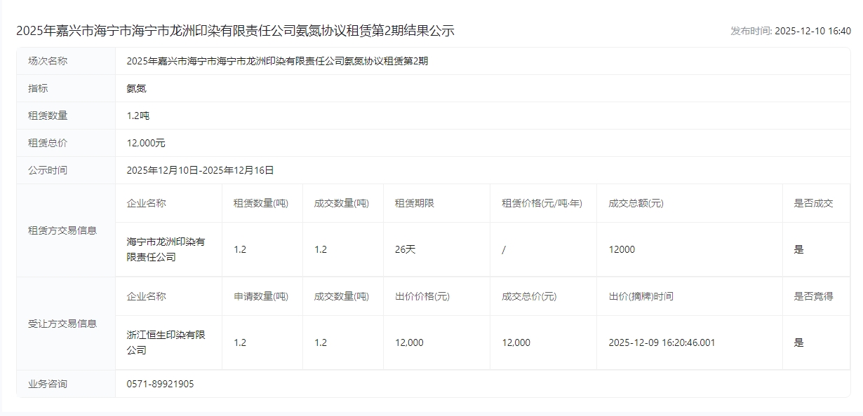 印染有限责任公司氨氮协议租赁第2期结果公示