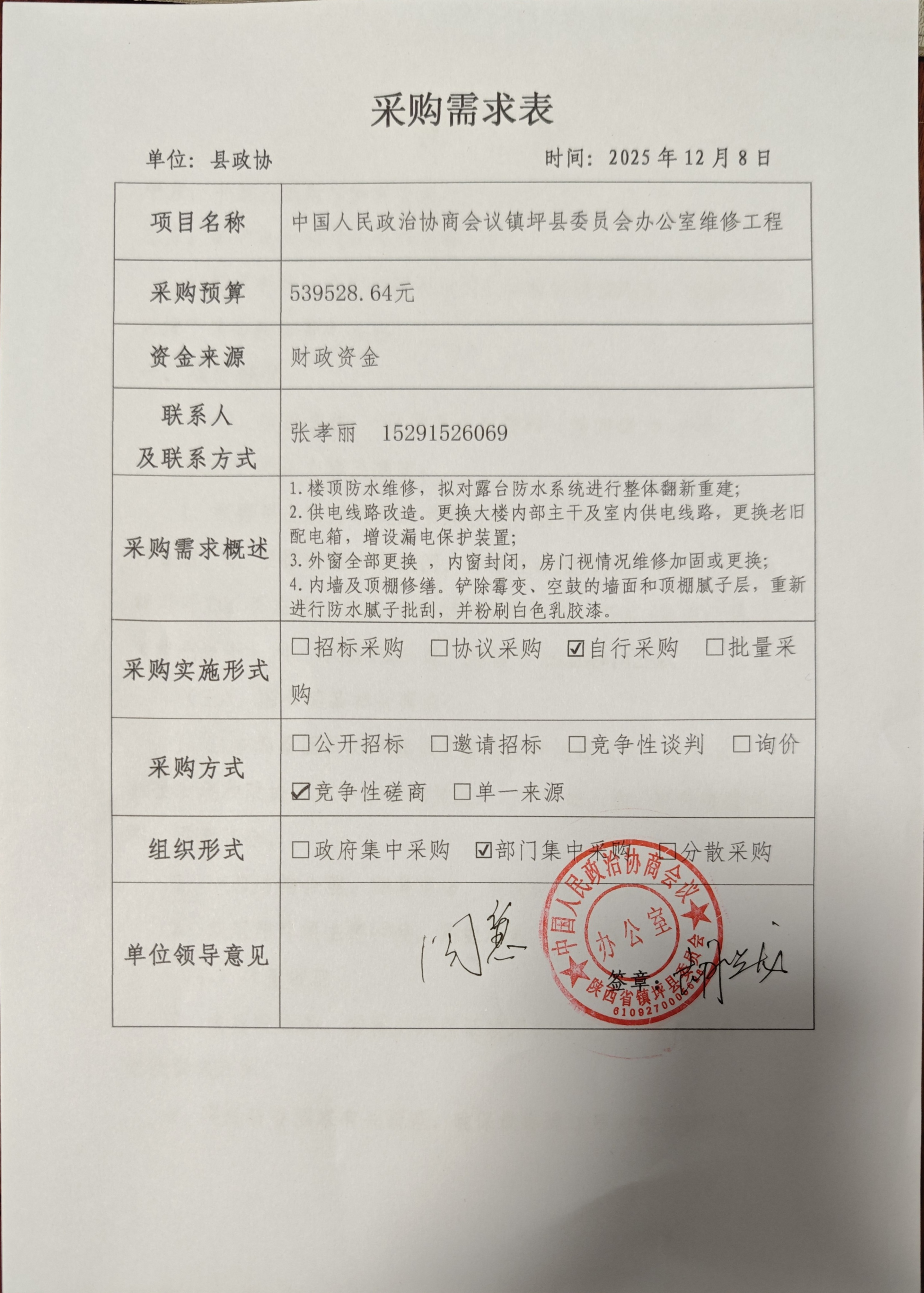 中国人民政治协商会议镇坪县委员会办公室维修工程竞争性磋商公告
